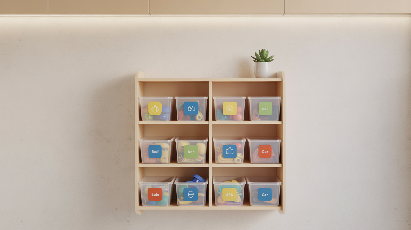 Transparent containers with picture labels help children independently find and return items. This visibility reduces dumping behaviors as kids can see the contents without emptying everything.