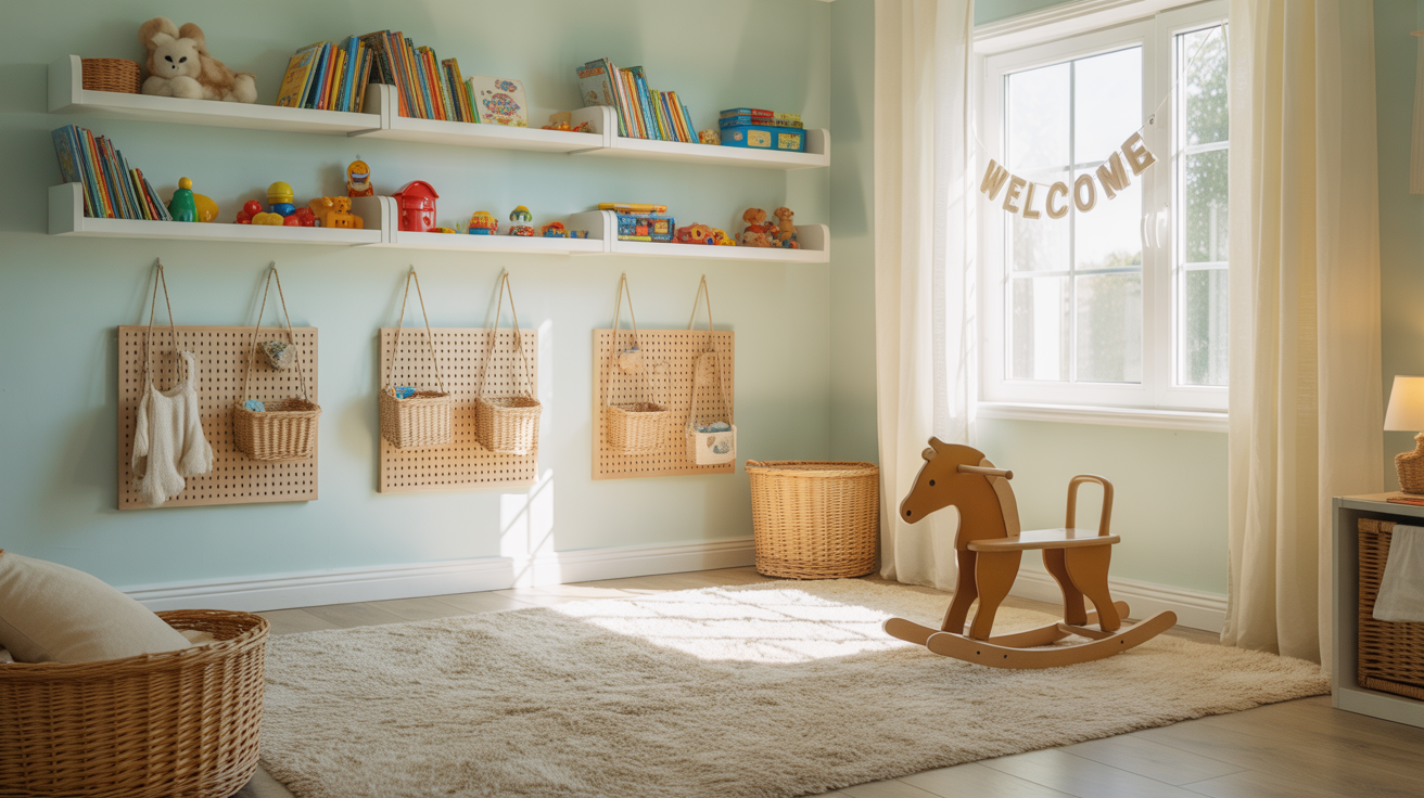 Wall-mounted shelving units and hanging organizers draw the eye upward, creating a sense of spaciousness while keeping toys accessible. This approach frees up valuable floor space for active play.