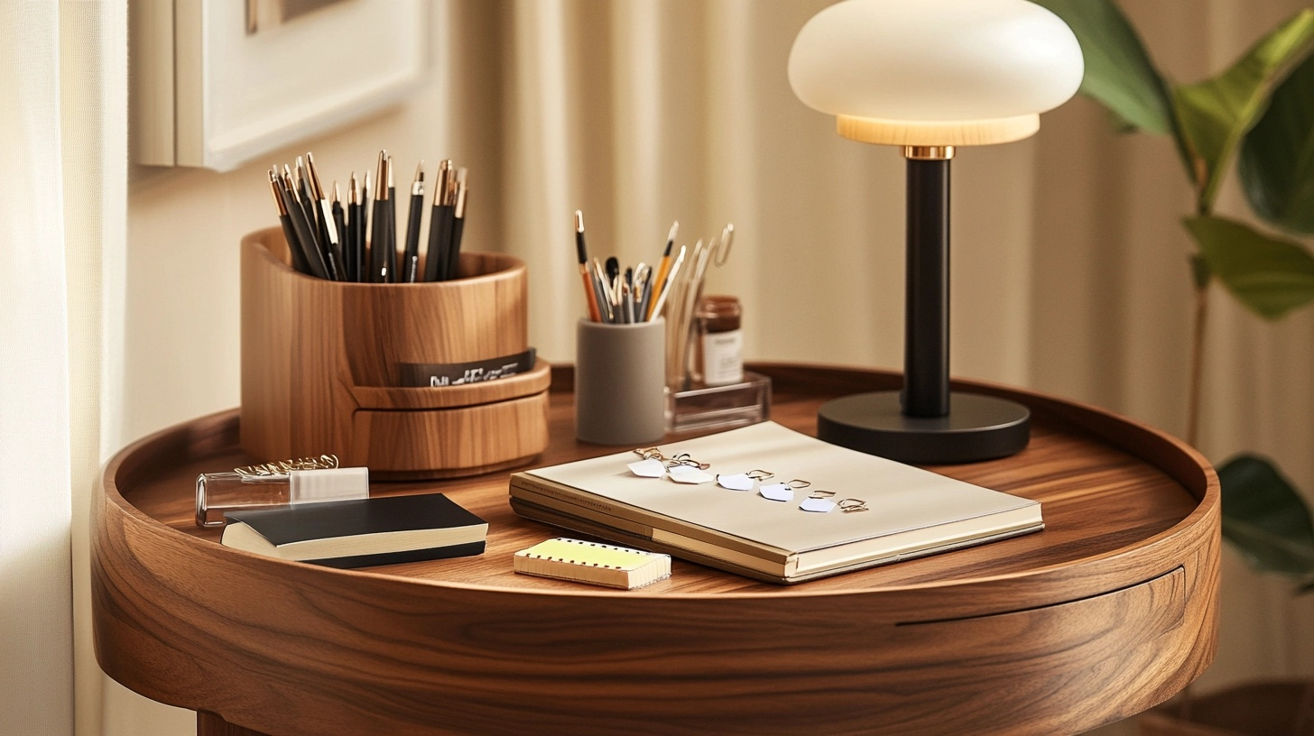 Office side tables need to earn their keep through usefulness. Choose containers that look good while holding pens, paper clips, and sticky notes. A small lamp provides task lighting when you need to focus on reading documents.