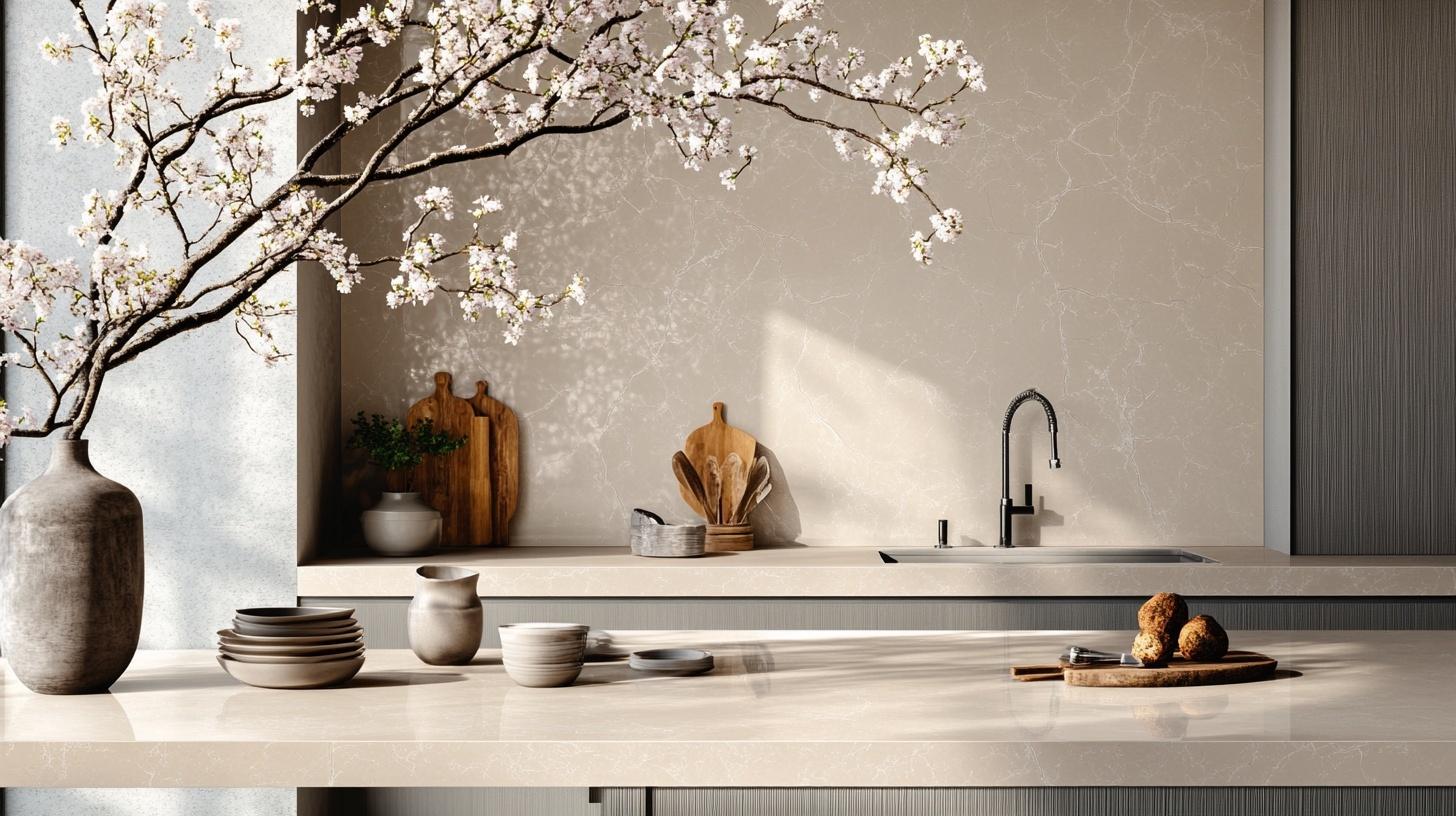 Using Soprano Quartz for backsplashes creates visual cohesion when paired with matching countertops.