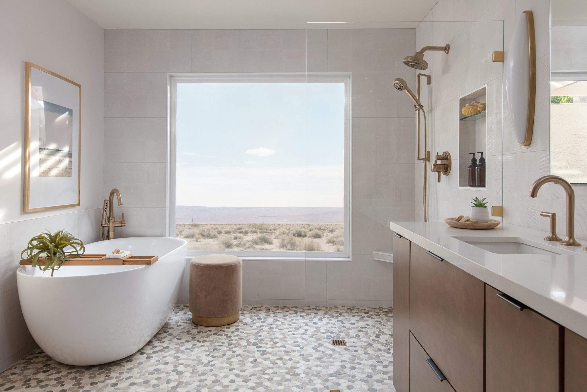 - Earth tones like mushroom and taupe complemented by live-edge wood vanities bring that Colorado outdoors feeling inside