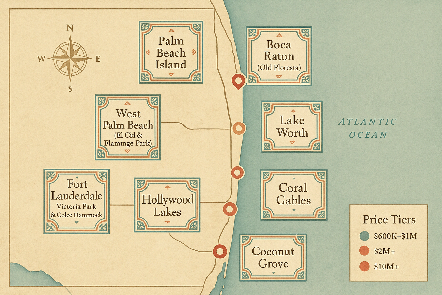 If you’re browsing listings in Miami-Dade, Broward, or Palm Beach County, you’ll spot these timeless details everywhere. Below, we’ll cover seven defining architectural features, map the neighborhoods where they appear, and track price momentum through 2025.