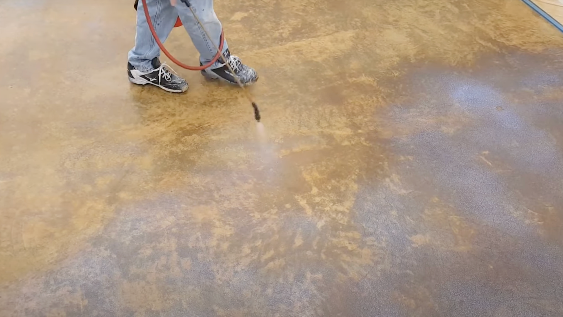 Using a pump-up sprayer, apply a coat of acetone-based or water-based stain evenly across the floor. The stain will penetrate into the concrete, creating rich color variations. Allow the first coat to dry before applying a second coat if desired.