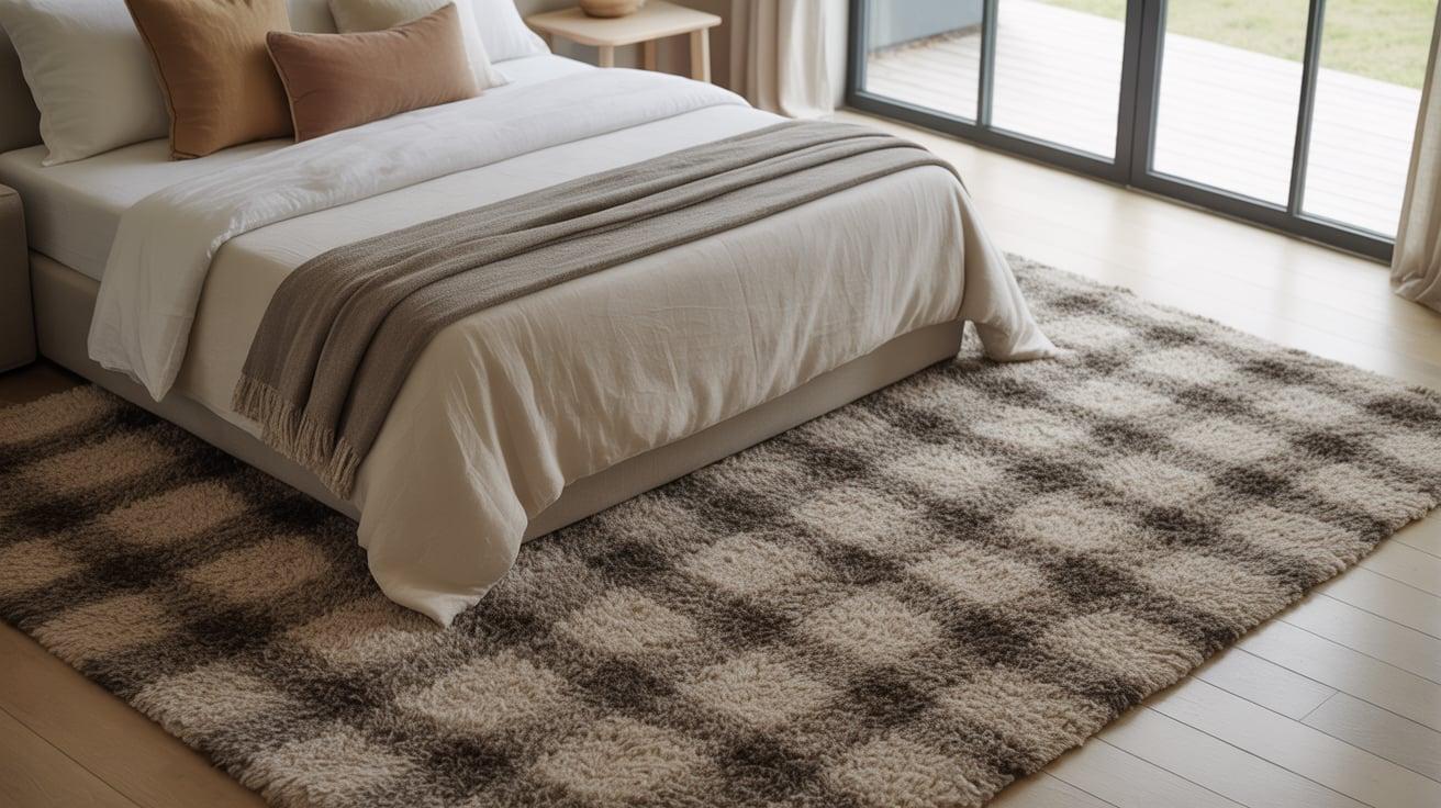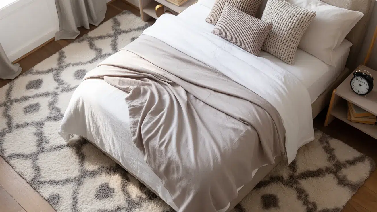 Runners (24″ x 72″) work well beside the bed for narrower spaces. Smaller bedrooms benefit from a 60″ x 96″ rug positioned partially under the bed, showing 12″ of floor at the foot and sides.