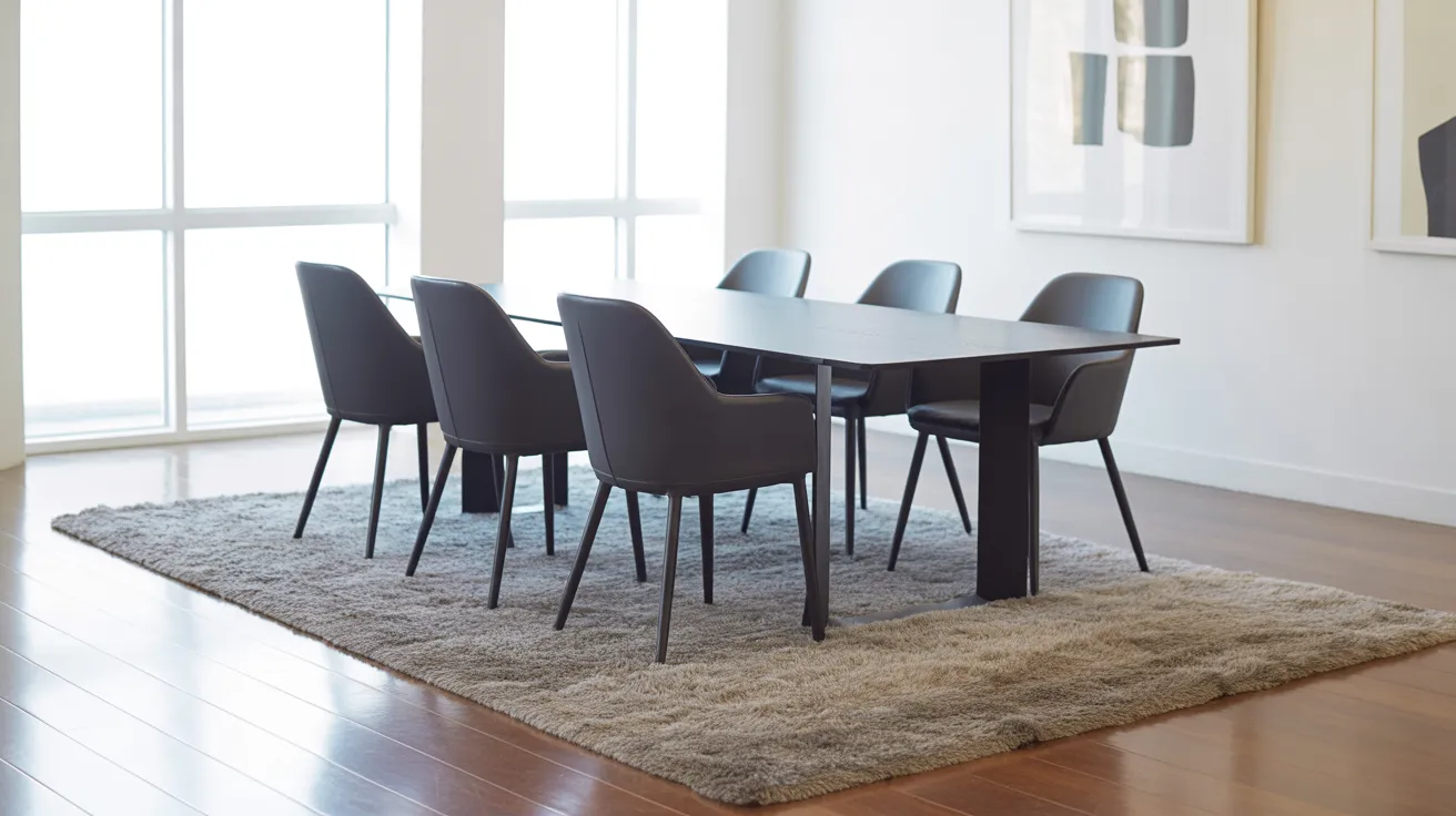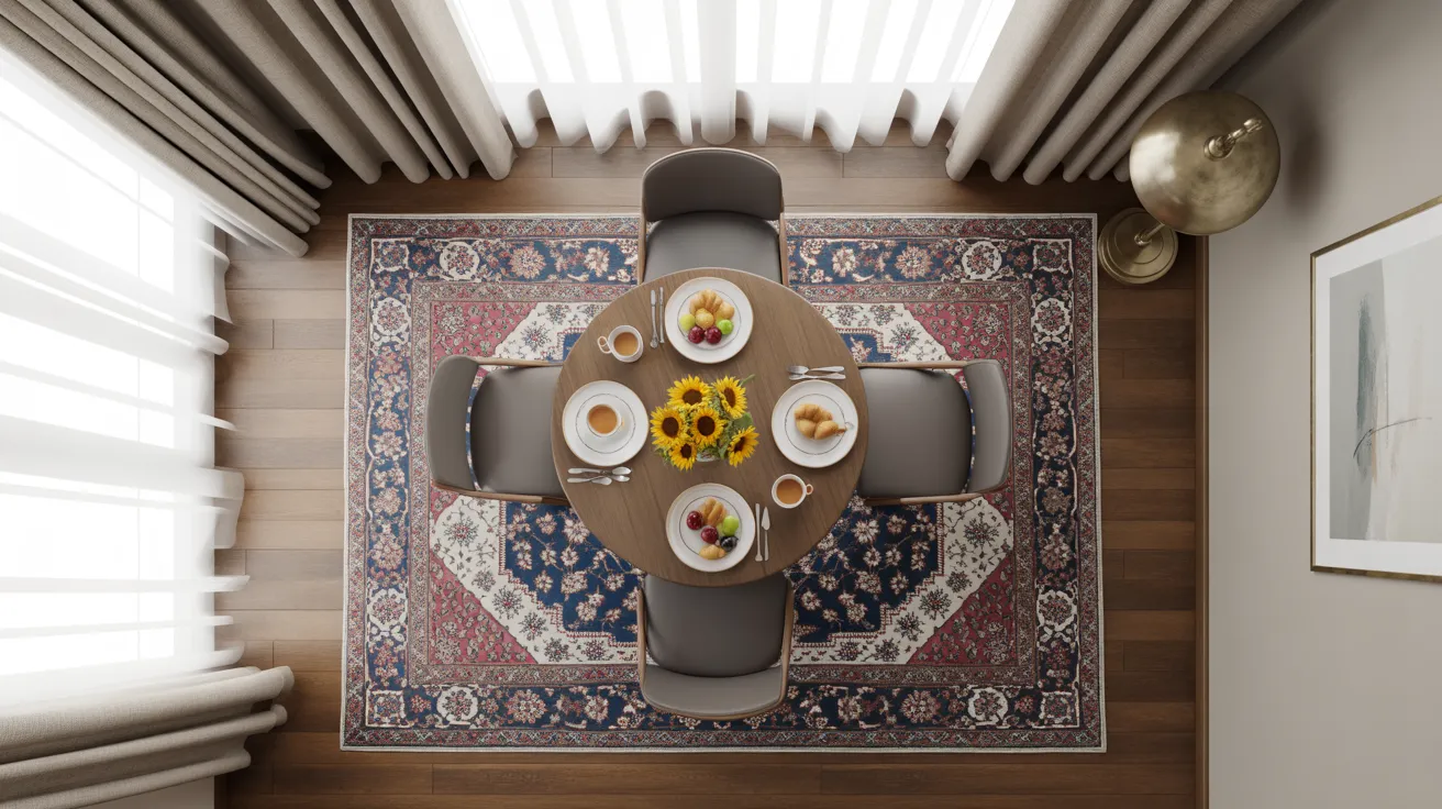 A typical 96″ x 120″ rug works well for most dining sets, ensuring chairs remain on the rug when pulled out. This prevents awkward sliding and protects your floor from scratches.
