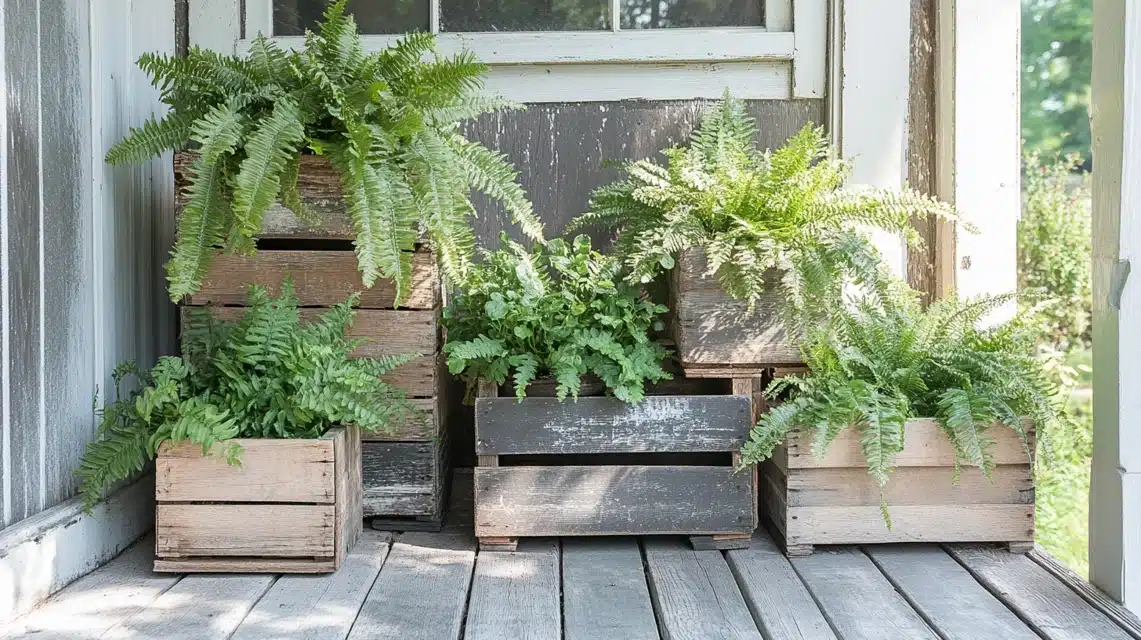 Each weathered crate now houses lush Button ferns, their delicate fronds contrasting beautifully with the rough wood.