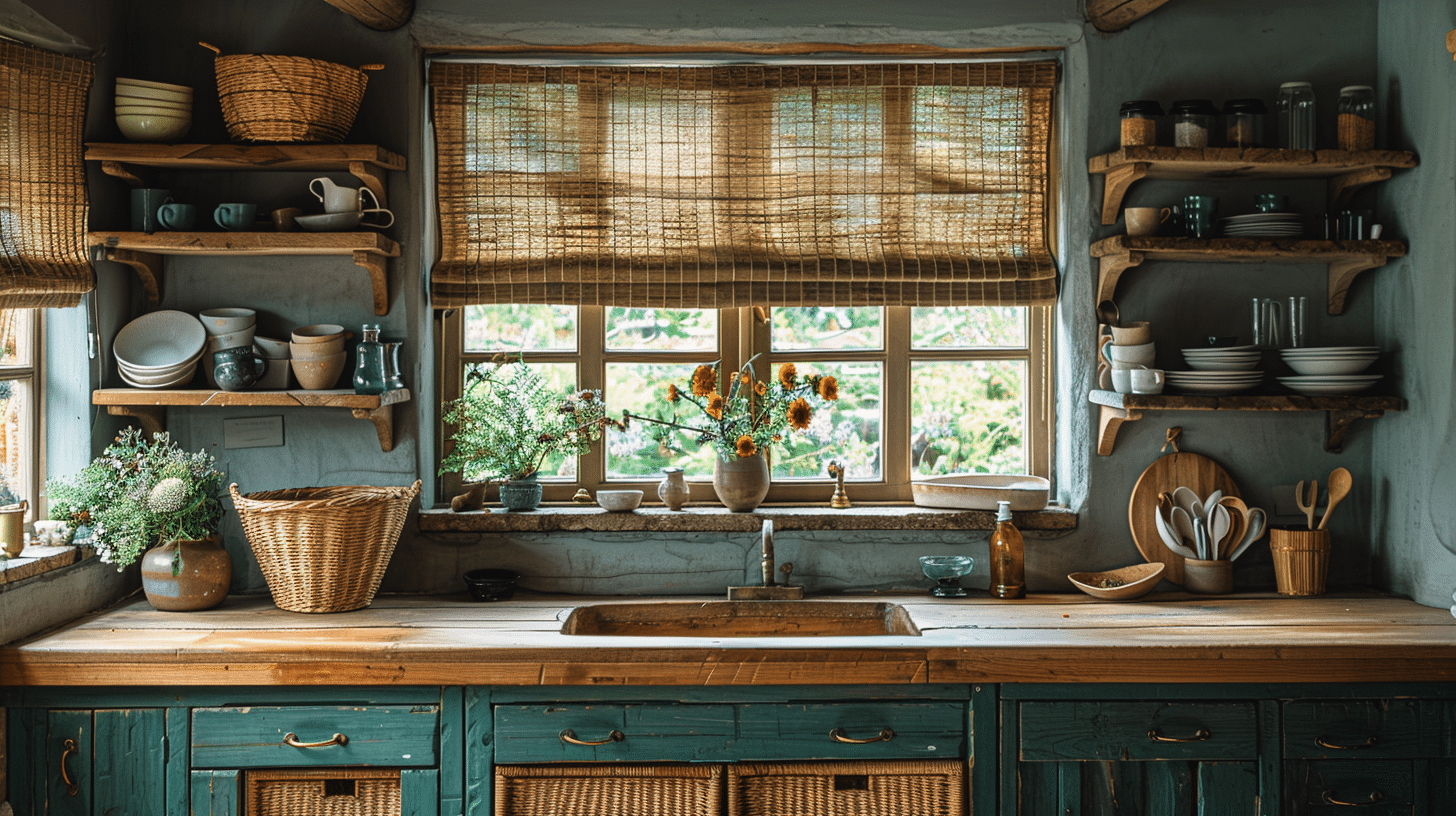 Bamboo shades bring a rustic, earthy feel to this cozy kitchen. Their natural texture and warm tones complement the wooden shelves and green cabinetry, creating a harmonious and inviting atmosphere.