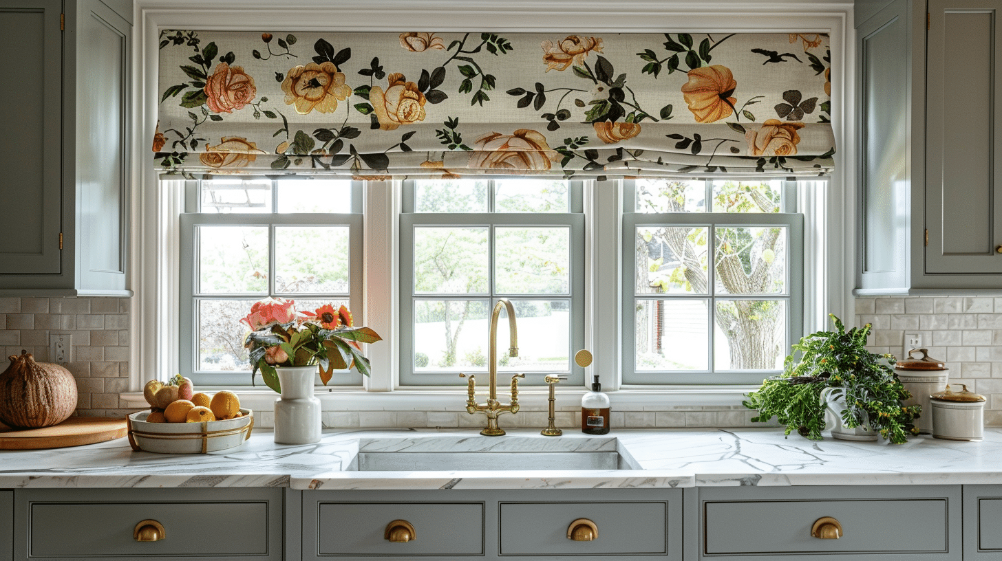 Floral Roman shades are a stylish choice for any kitchen decor, ideal for adding a pop of color and a bit of whimsy.