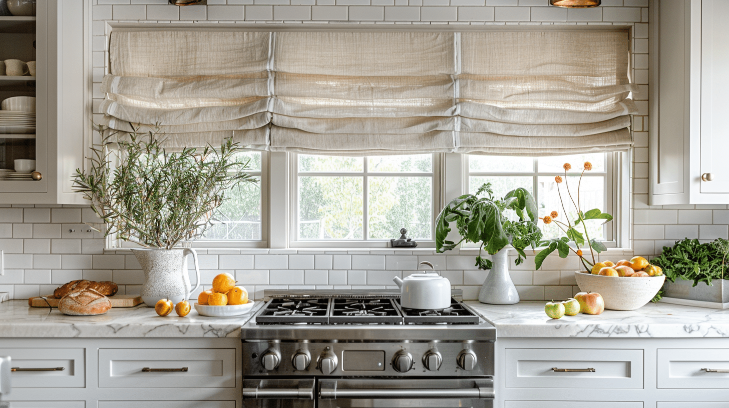 Semi-sheer Roman shades perfectly balance light and privacy in this sophisticated kitchen. Their soft fabric allows natural light to filter through, creating a bright, airy atmosphere while providing enough coverage.