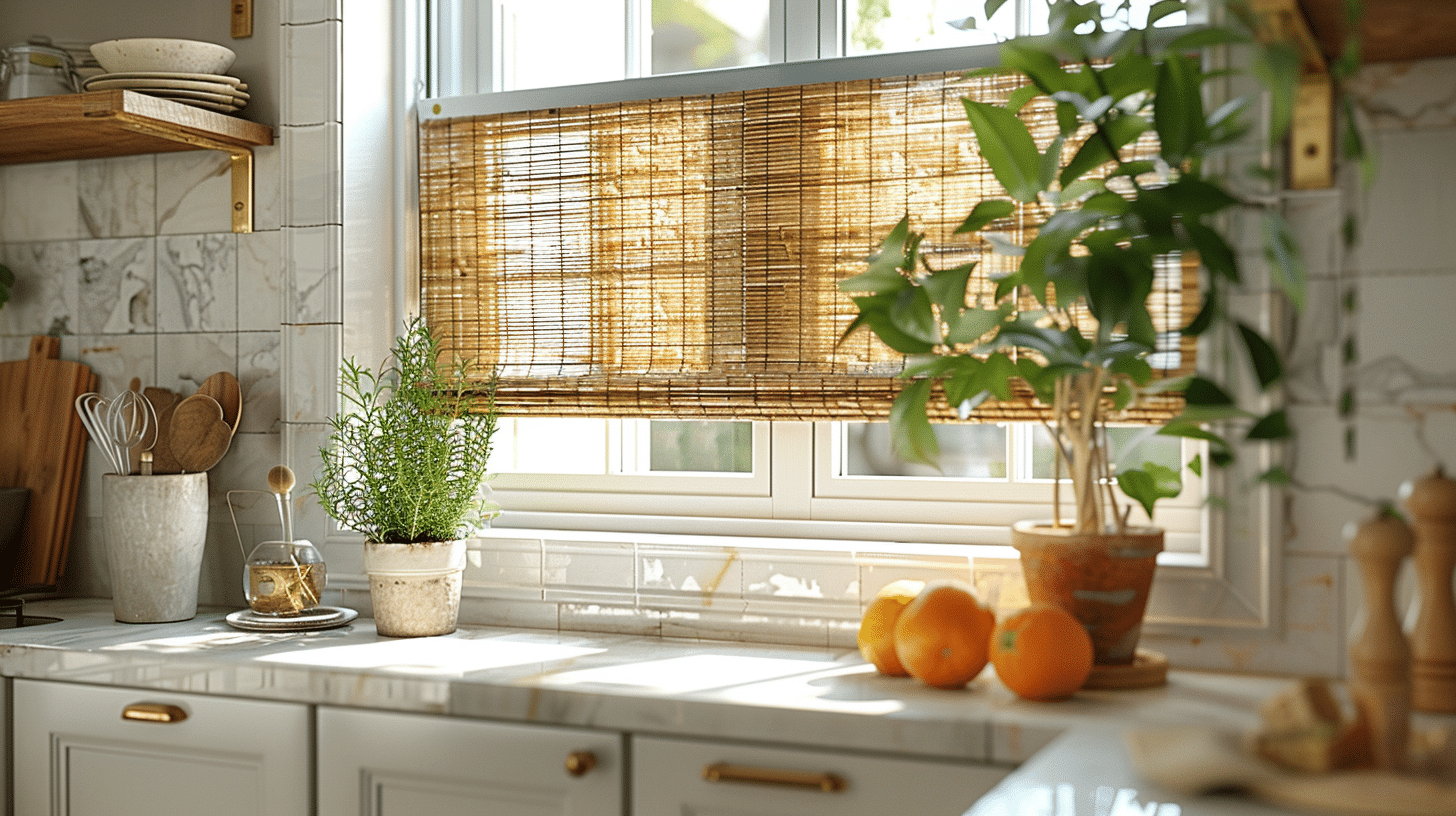 Rattan blinds offer a perfect blend of natural texture and practical functionality, as shown in this chic kitchen. These blinds provide a warm, organic feel that complements the wooden accents and greenery.