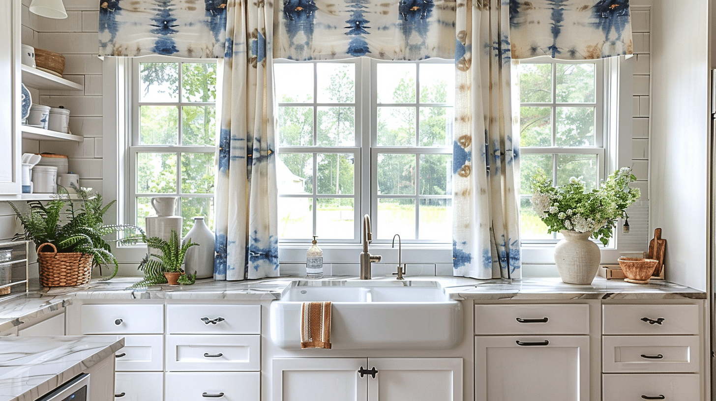 Shibori-dyed kitchen curtains add a vibrant and artistic flair to this elegant kitchen. The detailed blue and beige patterns create a unique focal point, complementing the white cabinetry and natural elements.
