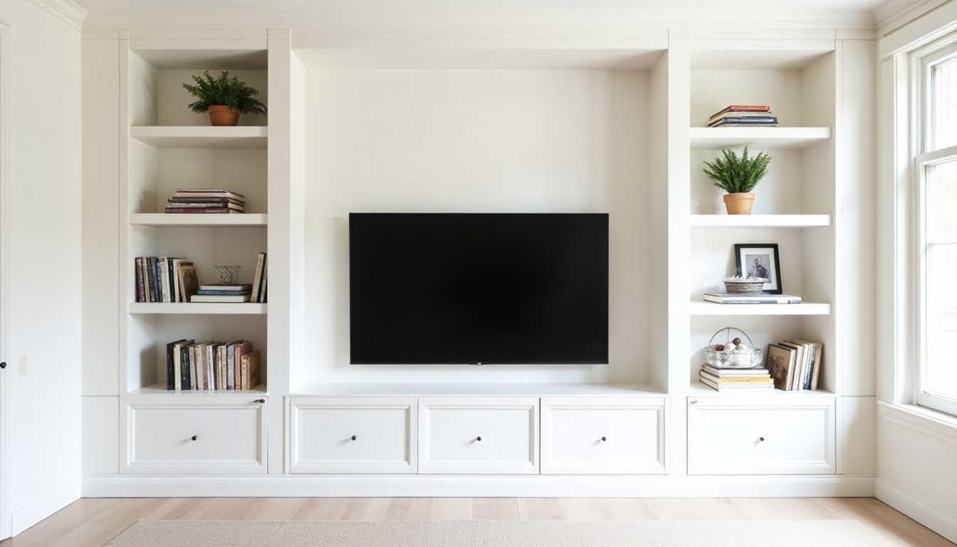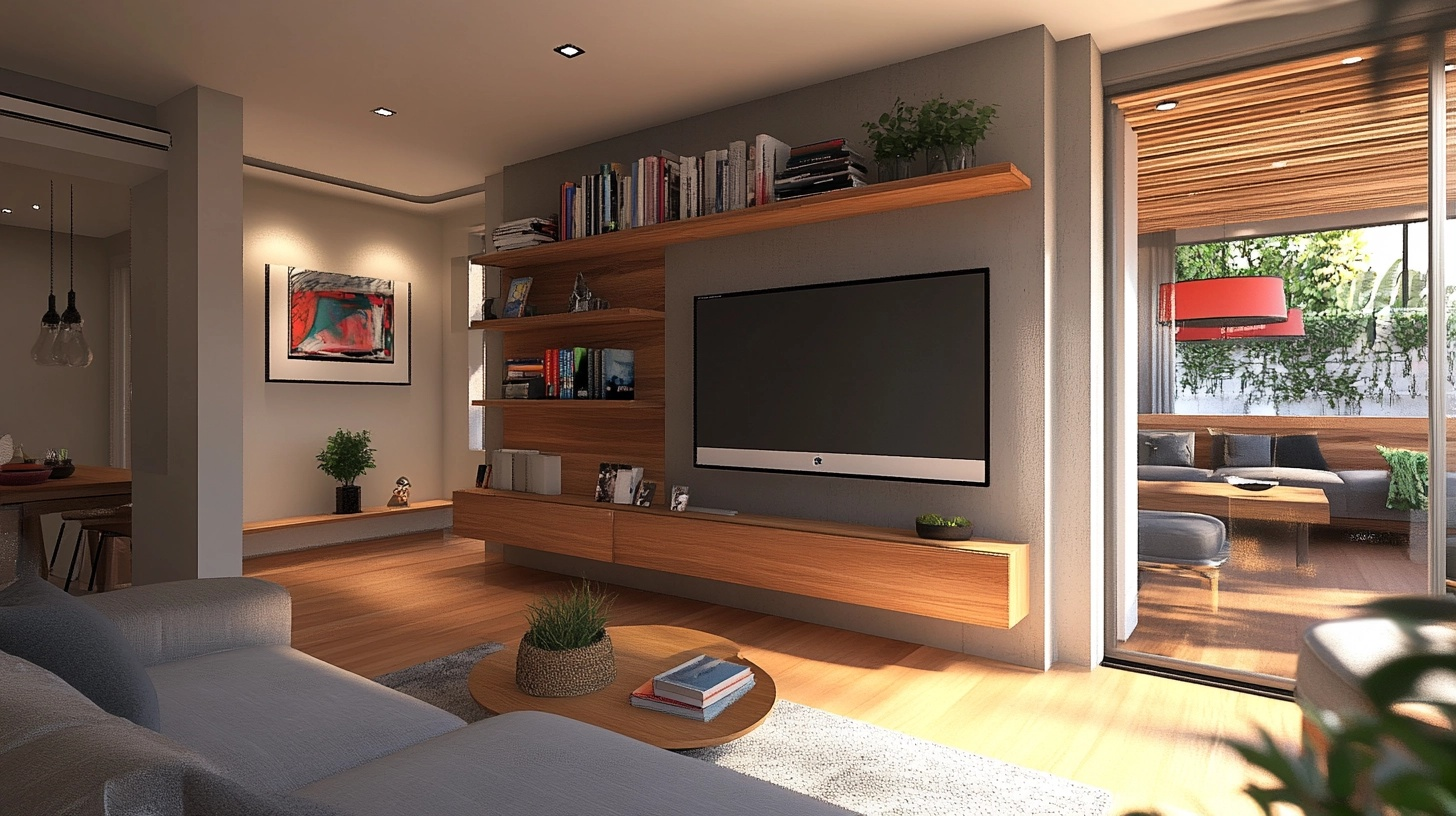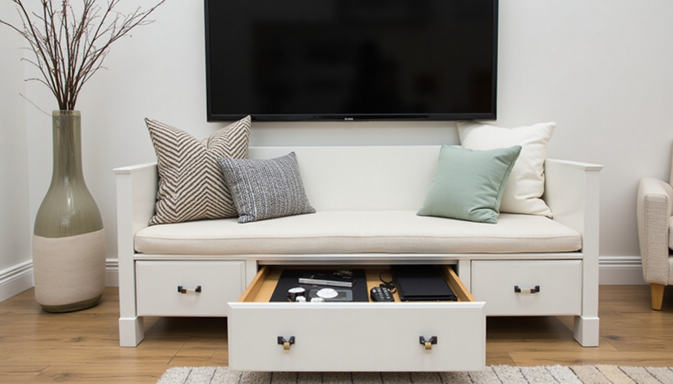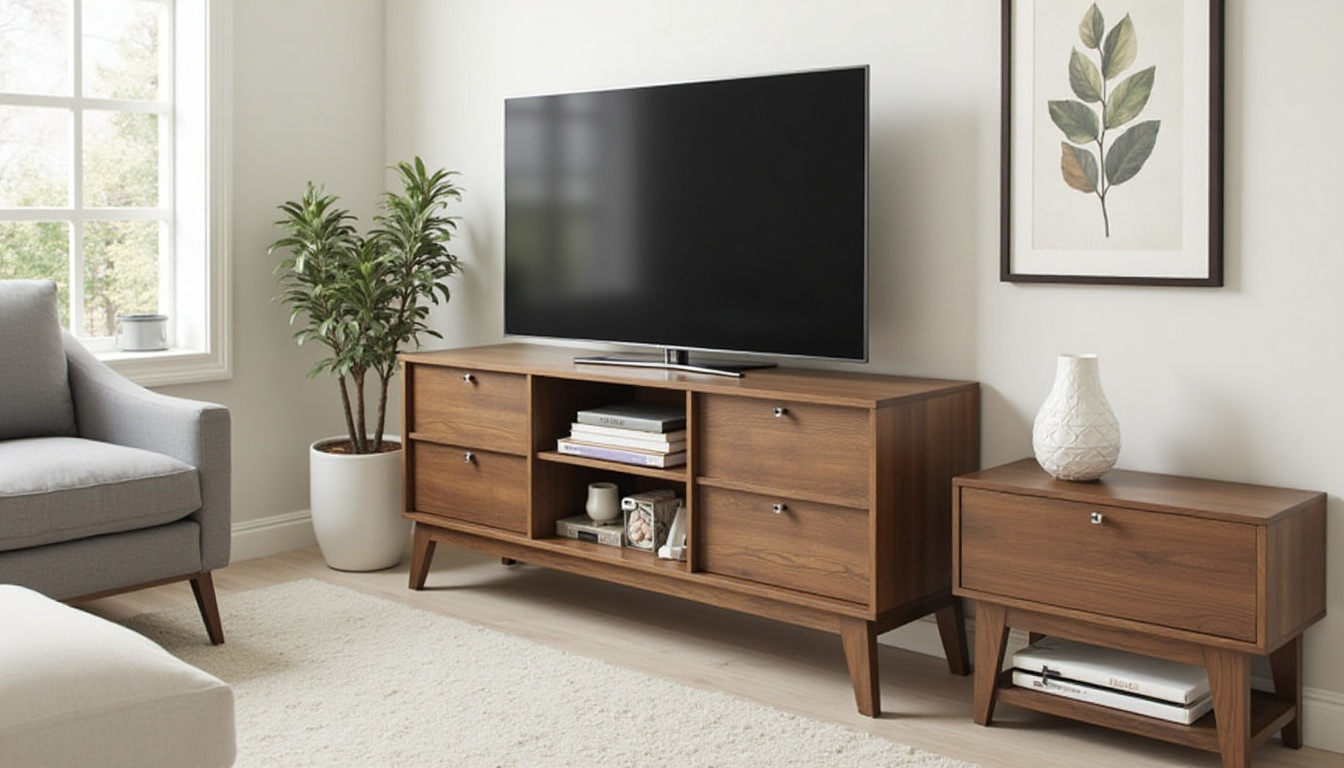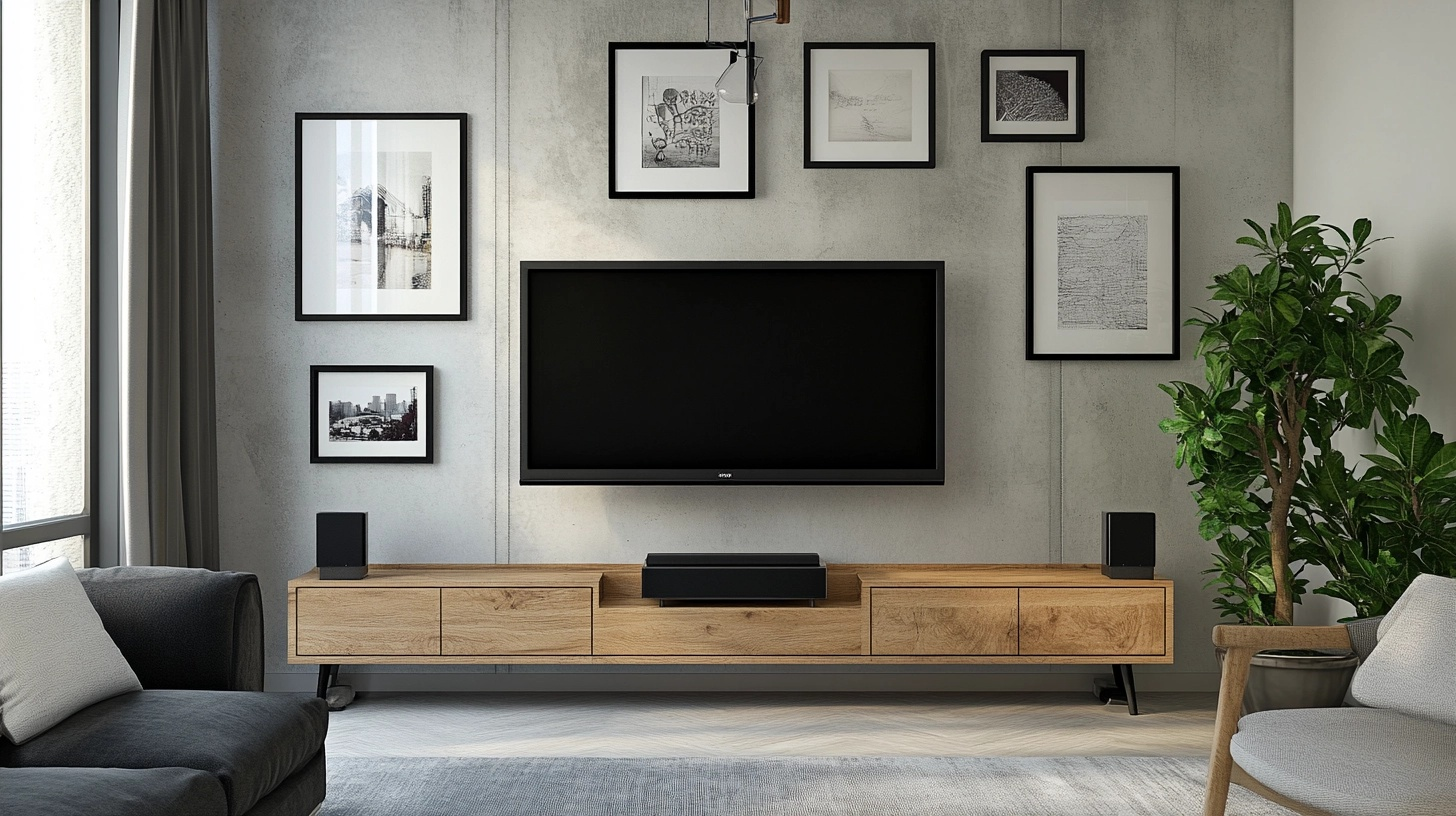 In small rooms, every piece needs to earn its keep. Look for TV stands with built-in storage drawers, or wall systems that include both TV mounting and shelving.