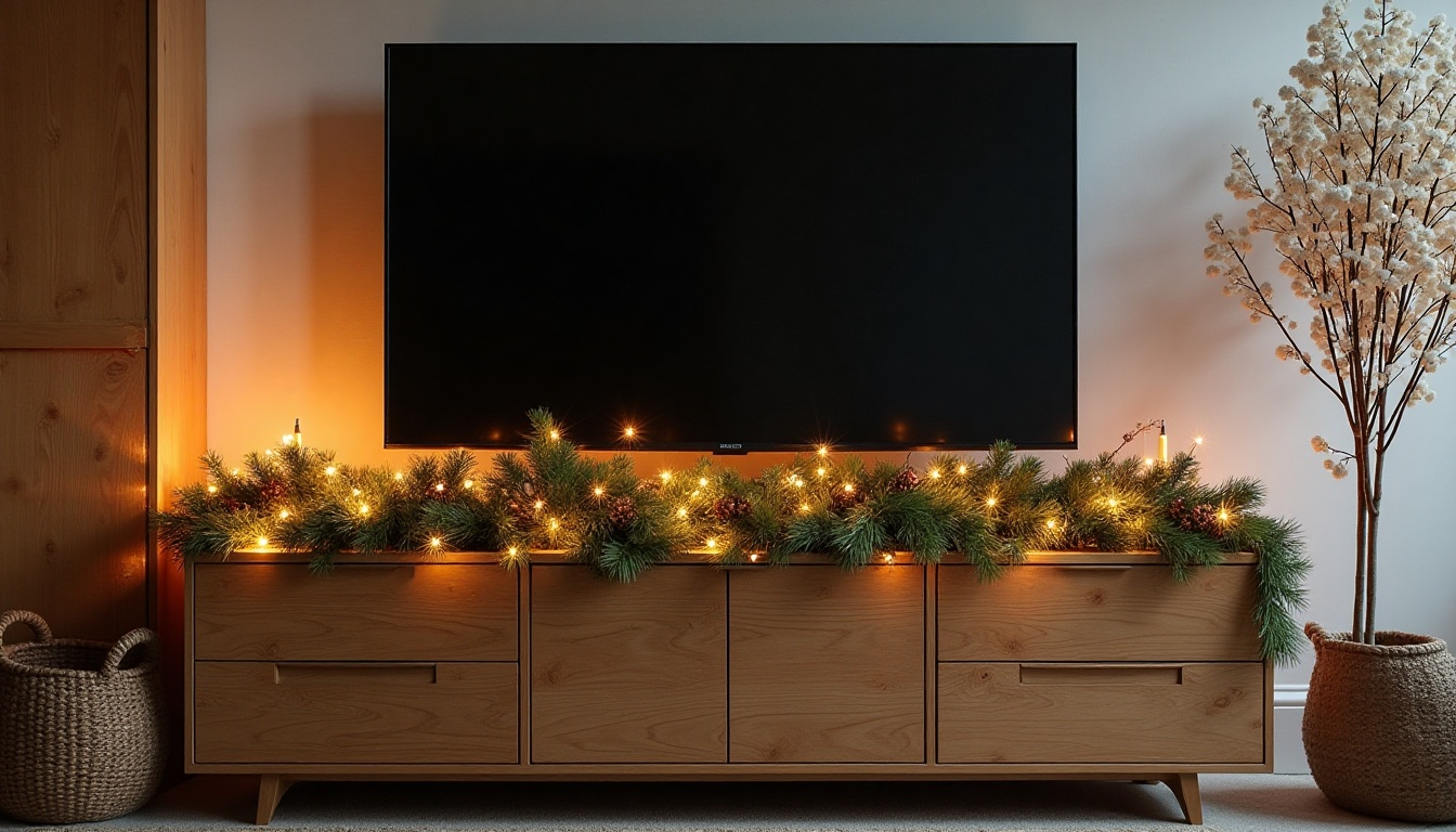 Draping garlands above or around your TV area brings the changing seasons into your home. Use pine branches with tiny lights for winter months, leaf garlands for fall, or flower strings for spring and summer.