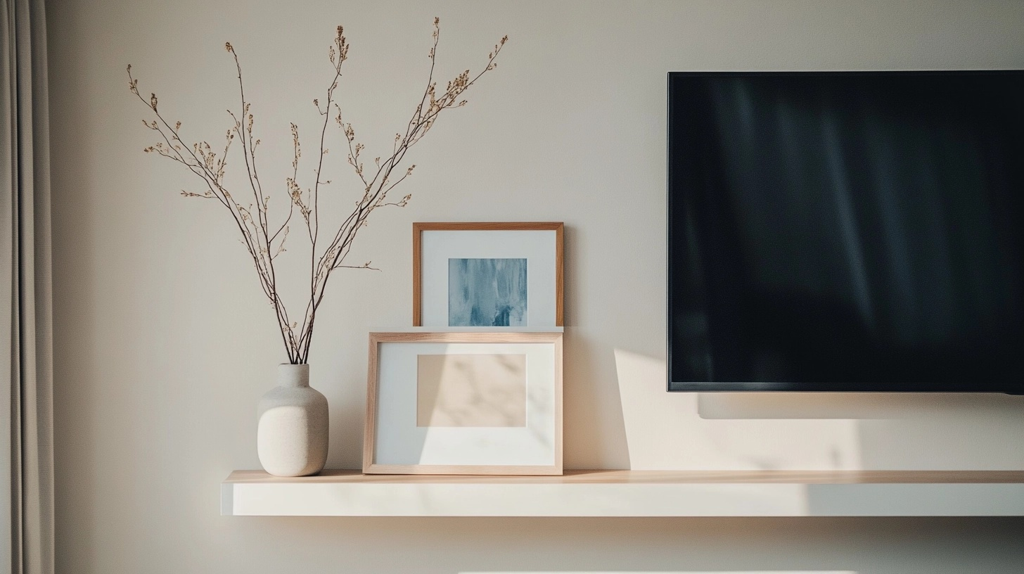 Installing a narrow picture ledge directly beneath your wall-mounted TV creates a sleek space to display art prints, photo frames, or small decor without cluttering the area.