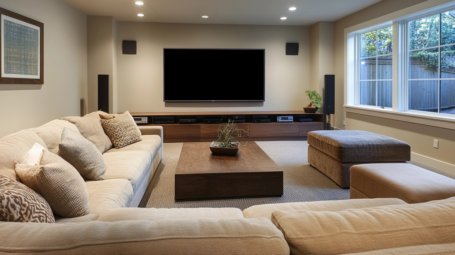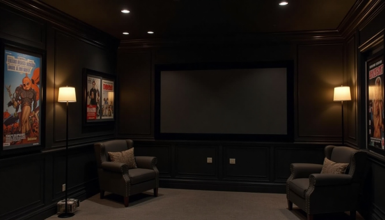 Add wall sconces with dimmers for perfect lighting control. Sound-absorbing panels disguised as art can improve your listening experience while adding style. Consider adding a row of movie posters for a true cinema feel.