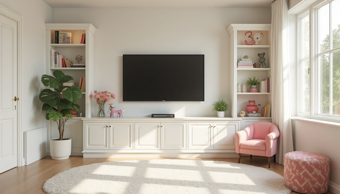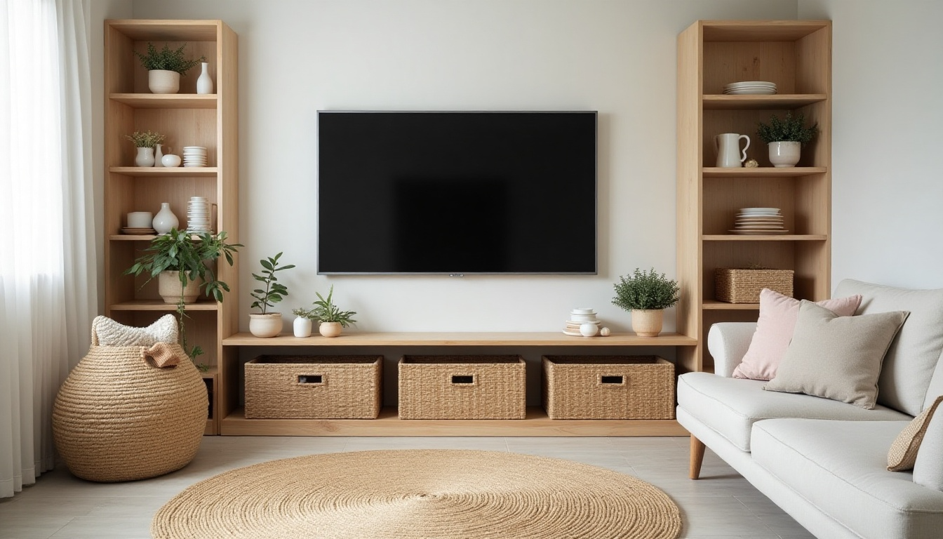 Wall pockets or bins can hold remotes safely. Consider using easy-to-clean materials for any furniture pieces, and make sure all TV mounts and furniture are safely secured to prevent tipping.