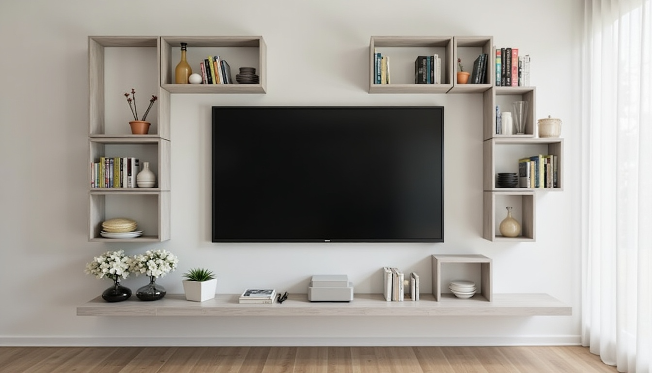 Mounting box-shaped shelves in a pattern around your TV creates a modern, geometric look. These cubes can hold small items or remain empty as pure design elements.