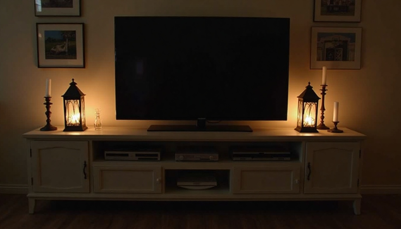 Setting candle holders or lanterns near your TV adds warmth through both their look and their light. Choose styles that match your room: modern glass, rustic metal, or classic ceramic.