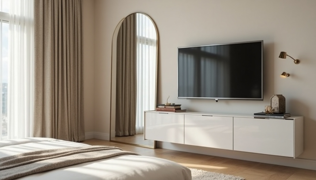 Use soft, calming colors around the TV to maintain the restful feel of your bedroom. A small floating shelf below can hold just the basics: a remote, a small clock, or a tiny plant.