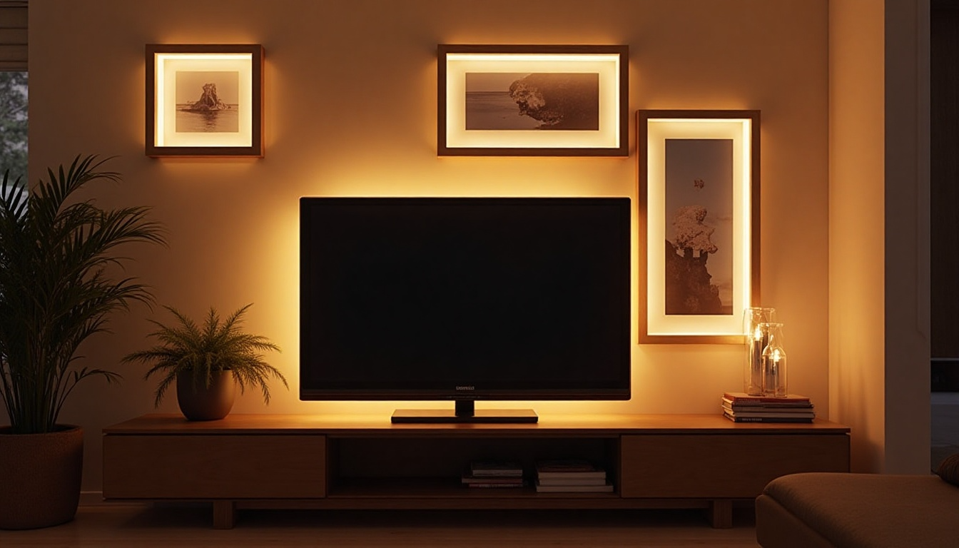 Placing frames with built-in lighting around your TV creates a glowing display that draws attention to your photos or art rather than the screen.