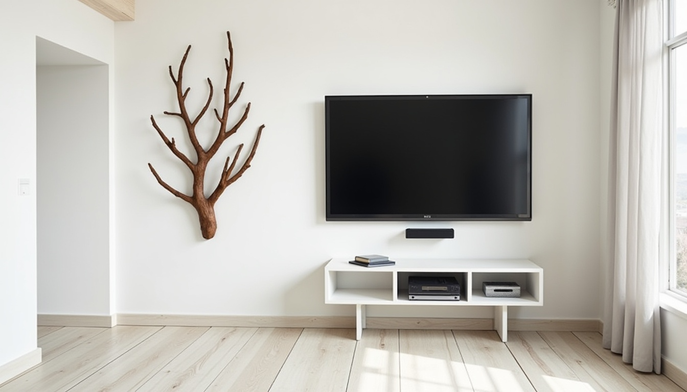 Hanging found wood pieces or branch art near your TV brings outdoor elements inside. These natural shapes with their curves and lines create an interesting contrast to the straight edges of your screen.