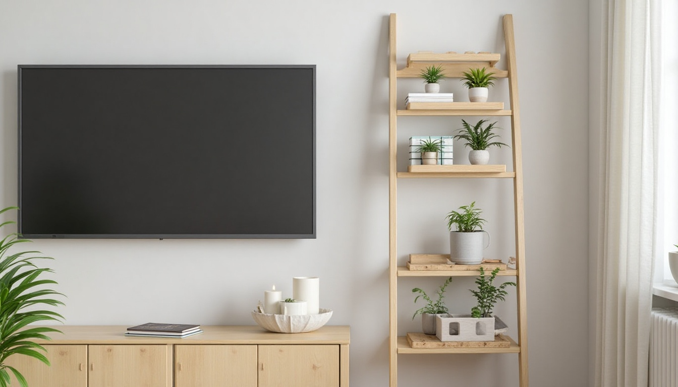 A leaning ladder shelf placed next to your TV area adds height and drawing power without taking much floor space.