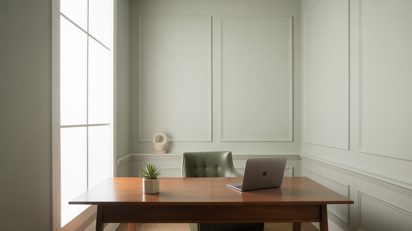 It creates a quiet backdrop that doesn’t distract. Use with muted blues or greens to focus the space. This makes Austere Gray perfect for work areas where you need calm, not clutter.