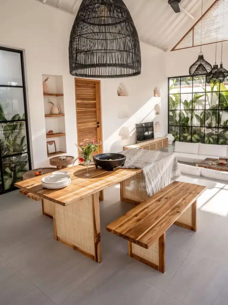 A wood dining table is a classic style that never goes out of fashion. The texture and color of the wood complement the bohemian aesthetic of the room. The addition of green plants, patterned table runners, and pendant lamps would be good styling accessories for this dining table.