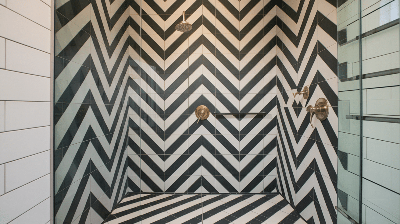Creating sharp angles and strong directional lines, zigzag patterns add energy and movement to shower walls. Unlike chevron or herringbone, zigzag uses tiles with angled edges that fit together to form continuous, jagged lines.