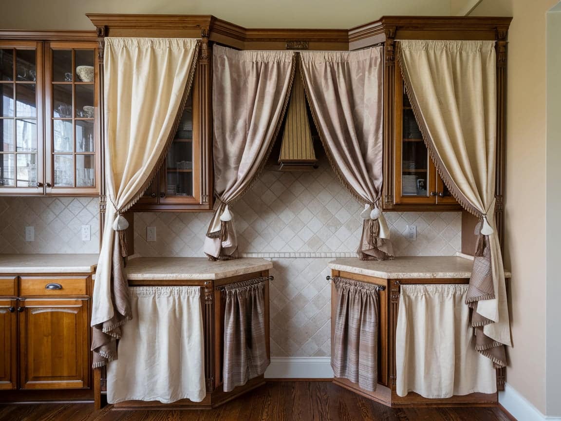 Replace some cabinet doors with curtains for a softer, more traditional look.