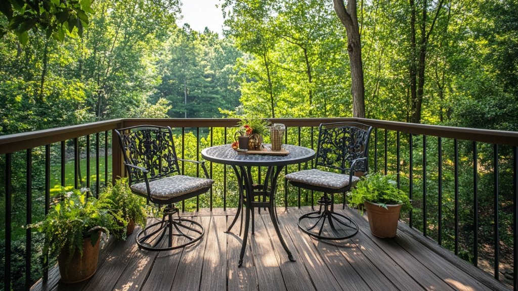 A bistro table and two chairs are ideal for small decks. This compact set provides a cozy spot for dining, sipping coffee, or enjoying a chat.
