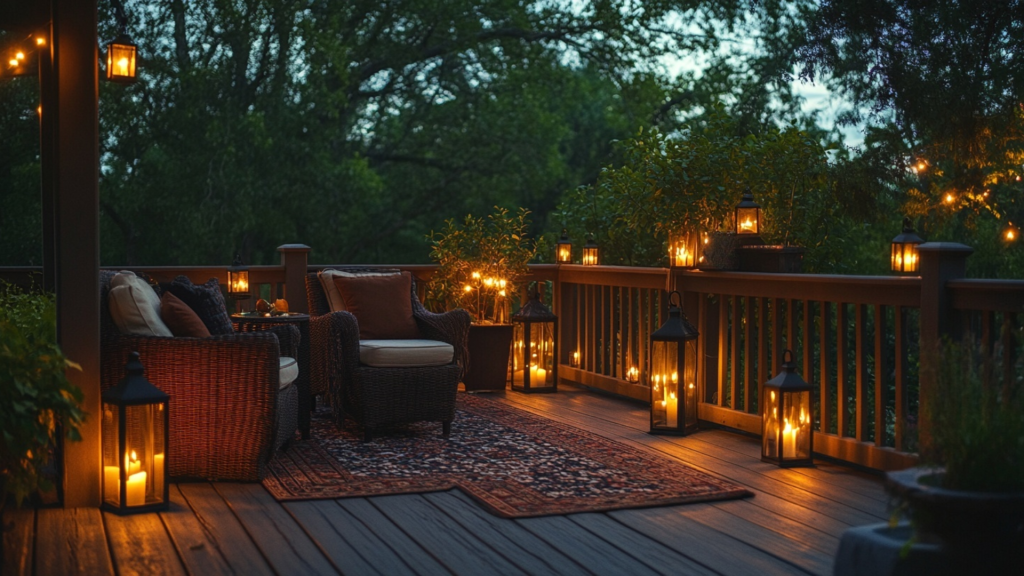 Lanterns with candles or battery-operated lights can be a stylish addition to your deck. Placing them in various corners or along the railing will create a rustic, warm glow.