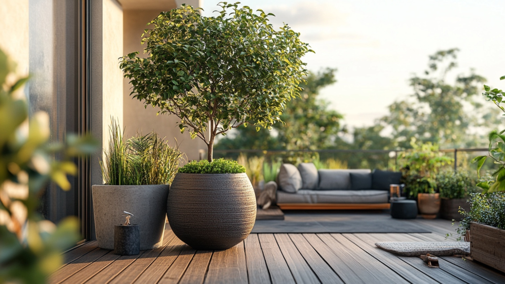 A small potted tree adds height and a natural focal point to your deck. Choose a tree that suits your climate, like a dwarf citrus or an ornamental tree.