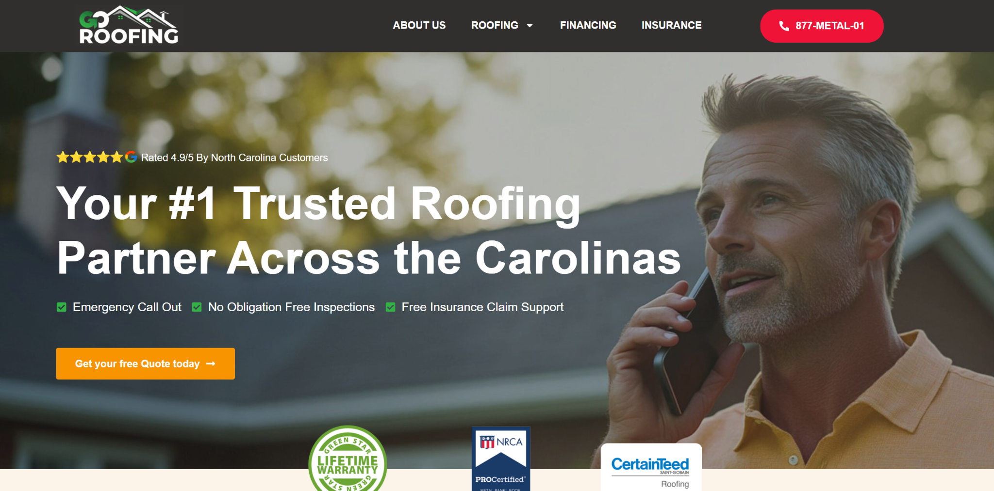 Go Roofing brings speed, clean execution, and strong insurance help to the table. They cover Wilmington with same-day or next-day inspections, drone imaging when needed, and a financing lineup that keeps metal and high-efficiency options within reach.