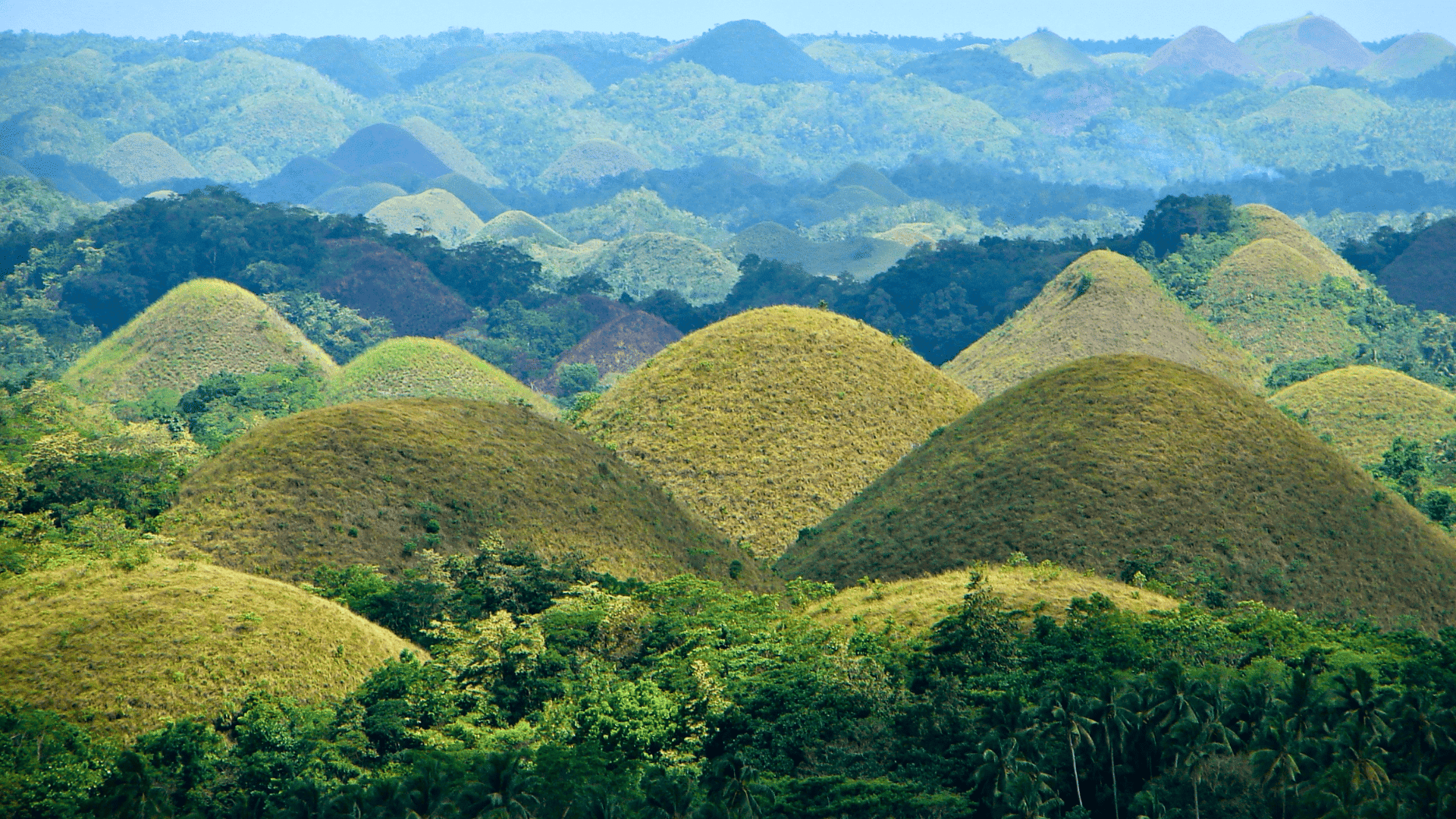 Chocolate Hills is a famous natural formation in Bohol. The landscape is made up of over 1,200 cone-shaped hills that turn brown during the dry season, resembling chocolate mounds.