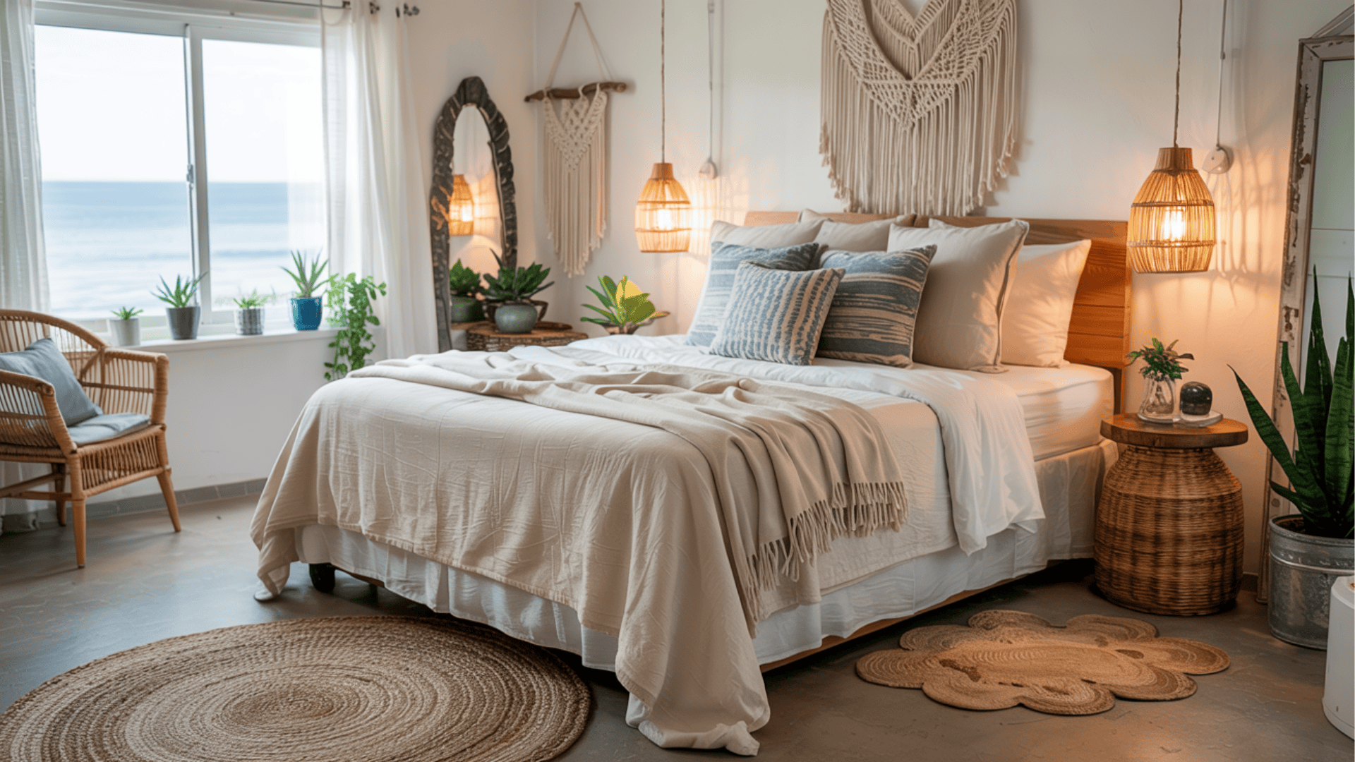 Combine coastal elements with bohemian decor for a relaxed, eclectic feel. Layer natural materials, such as woven rugs and macramé wall hangings, along with earthy tones, to create a laid-back beach vibe that keeps the space cozy and inviting.
