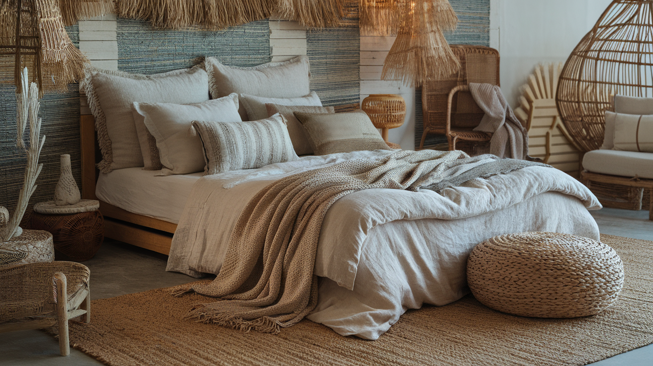Mixing textures, such as a plush velvet throw, woven wicker, and a jute rug, adds depth to your coastal bedroom.
