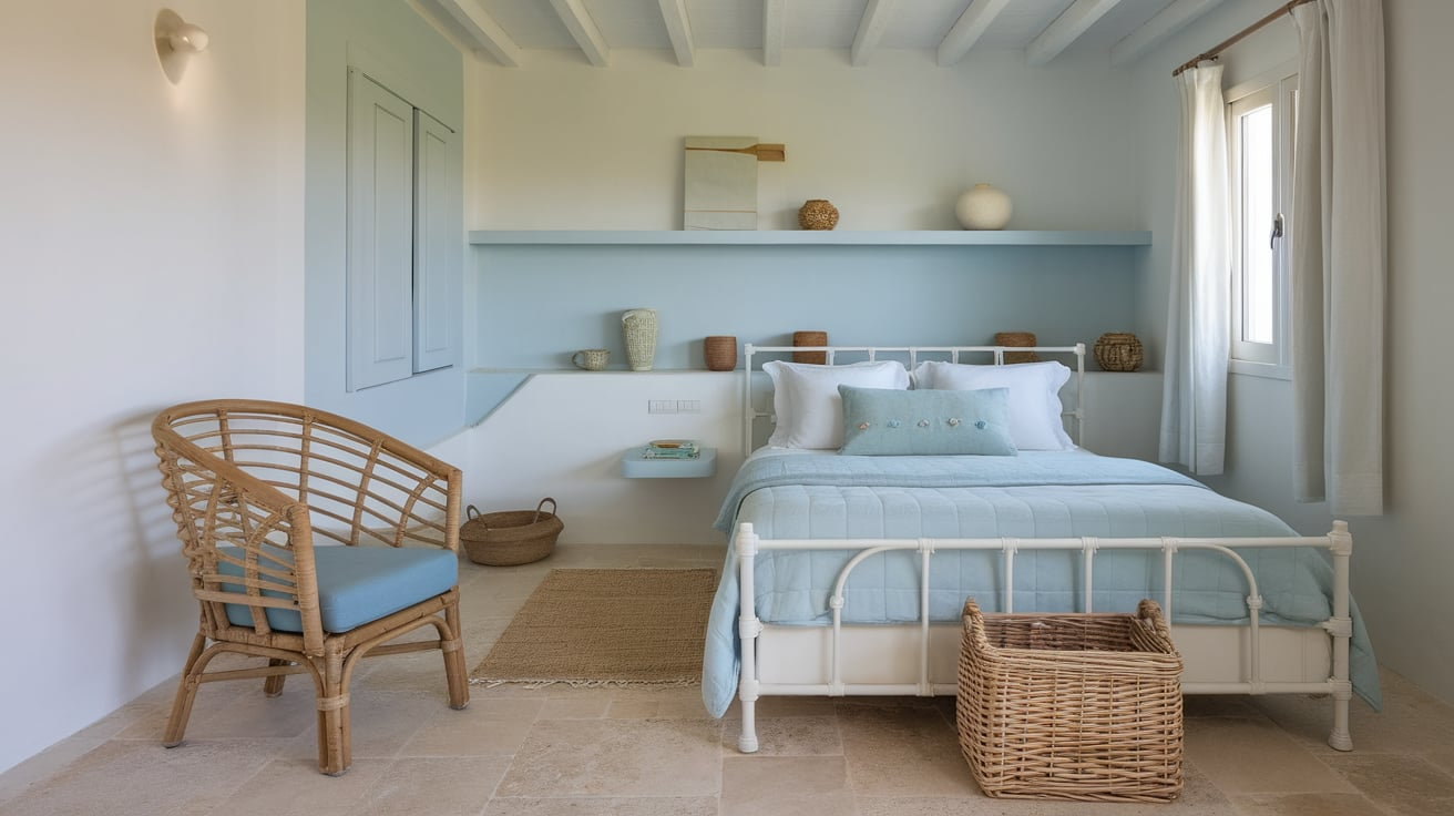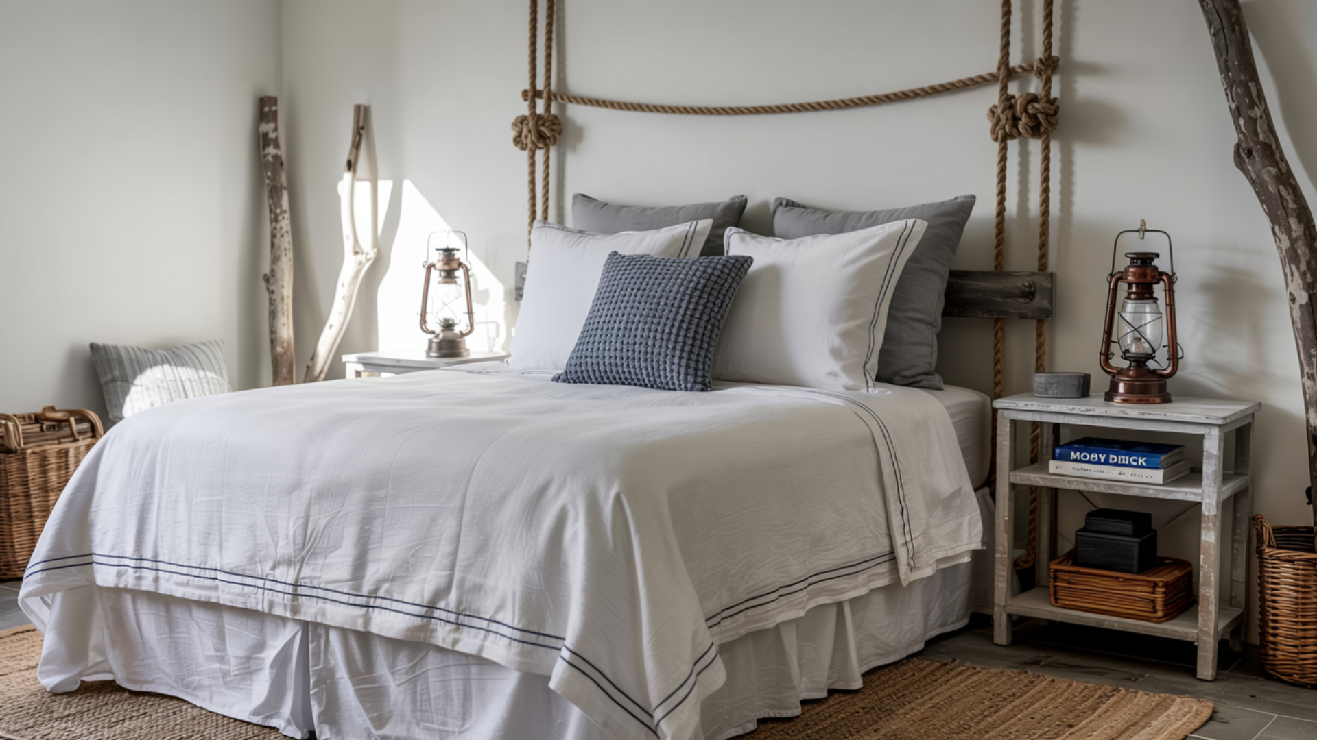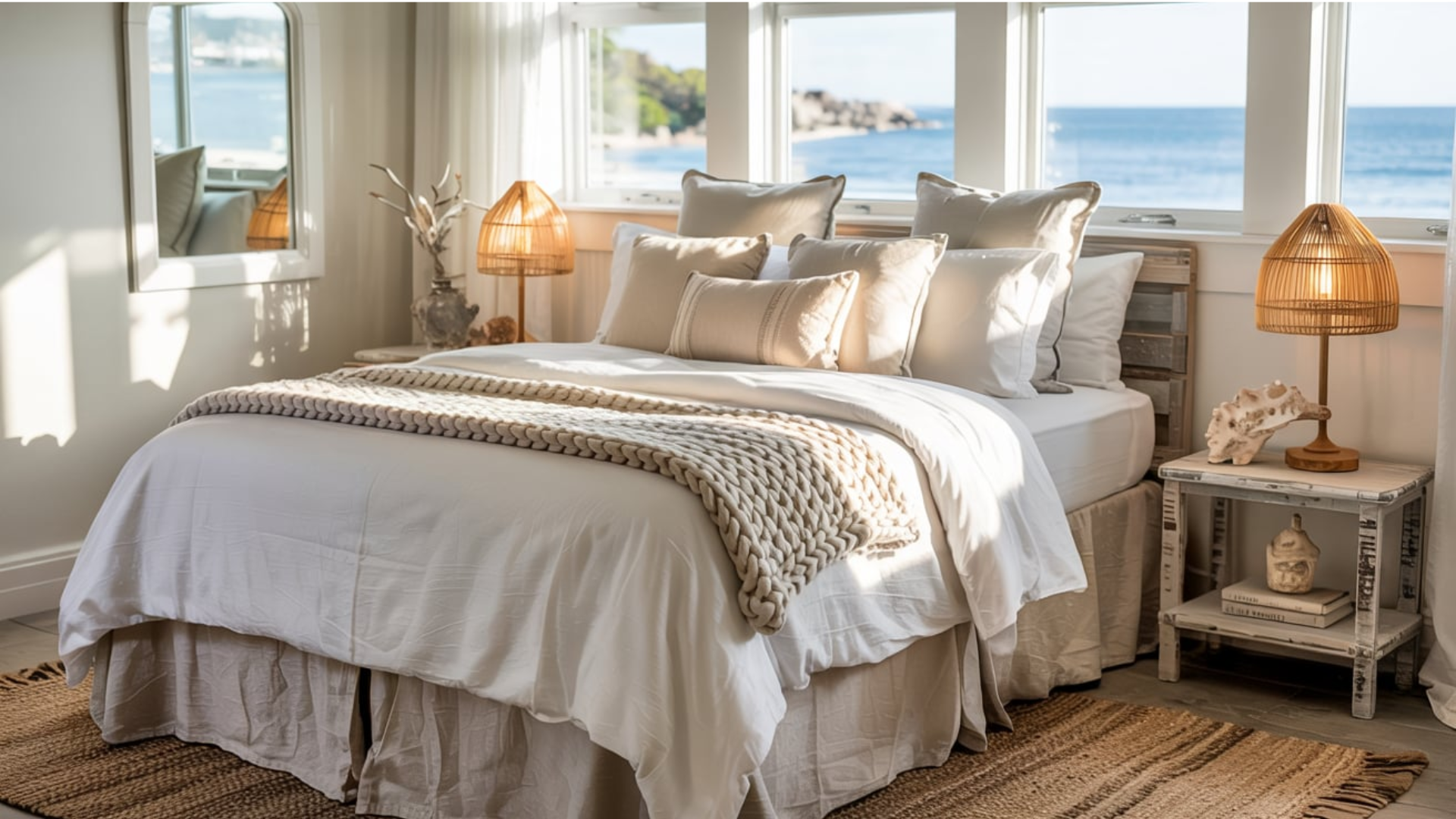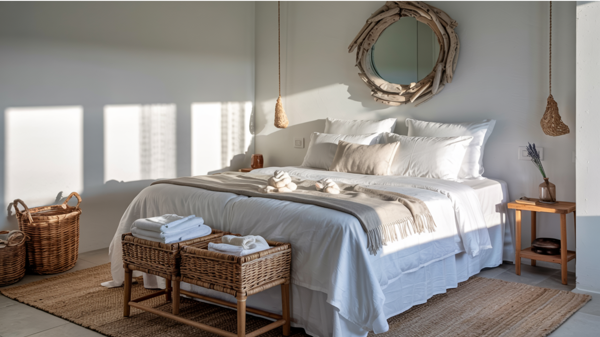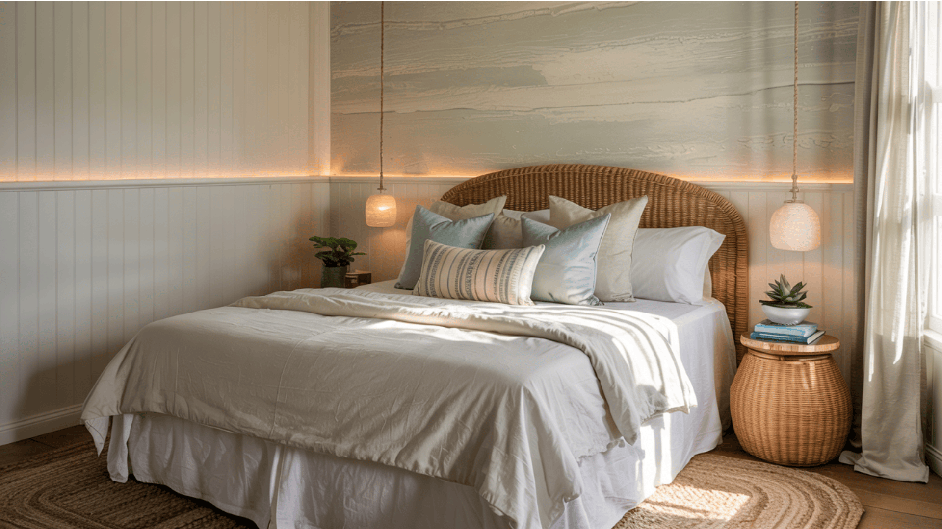 Add plush bedding, throw pillows, and breezy elements like driftwood accents and a wicker headboard for warmth and airy relaxation.