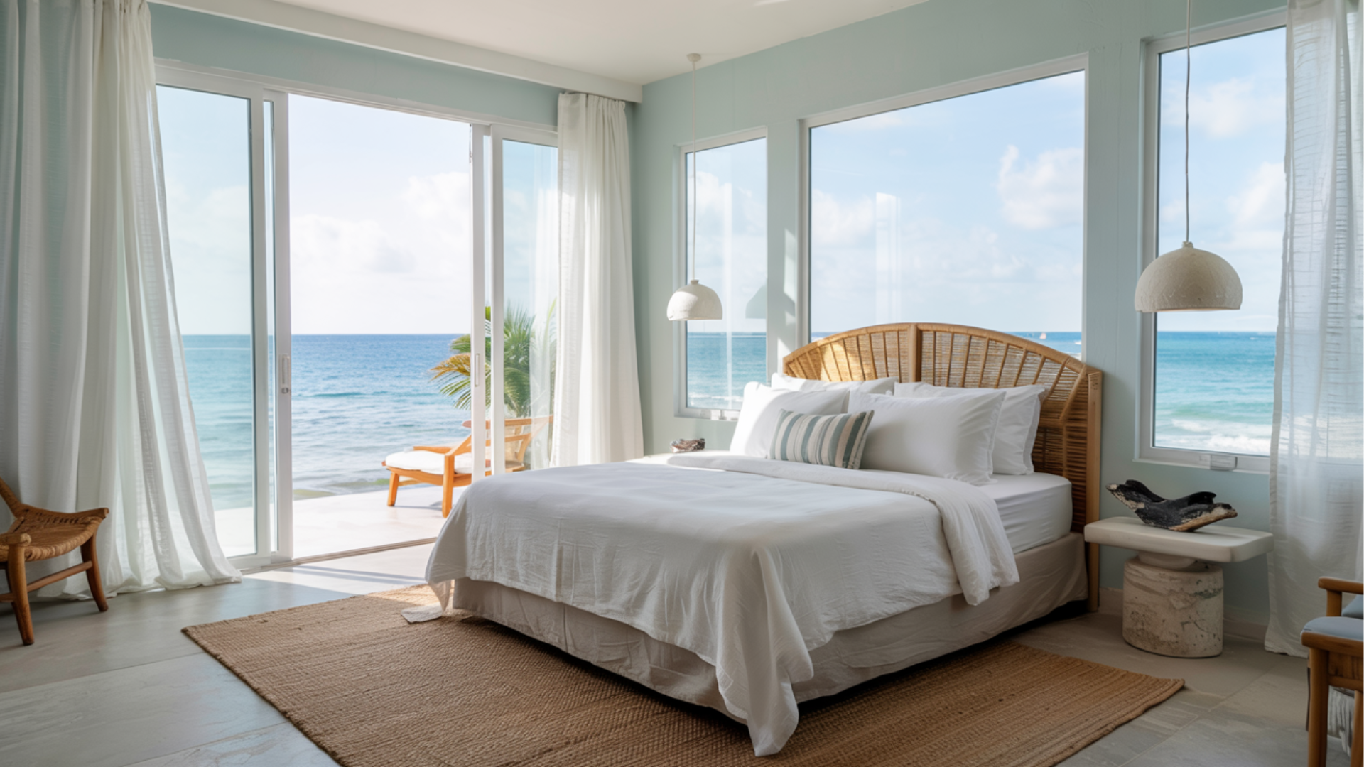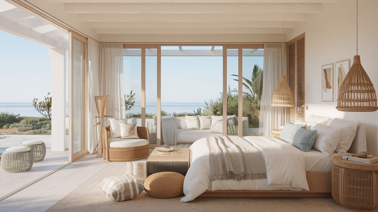 A coastal bedroom with direct access to the outdoors can enhance the relaxed atmosphere.
