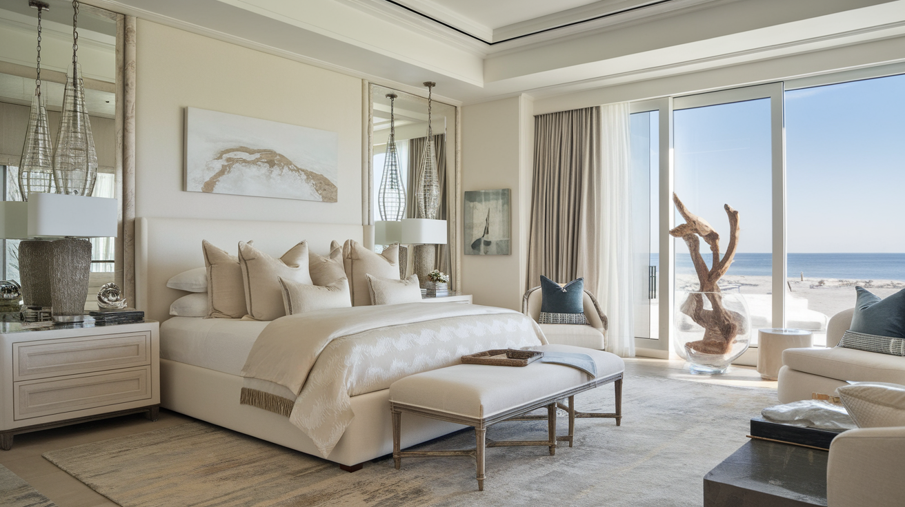 Use soft, neutral colors paired with rich textures, such as velvet or linen, for a high-end, serene retreat with a coastal flair.