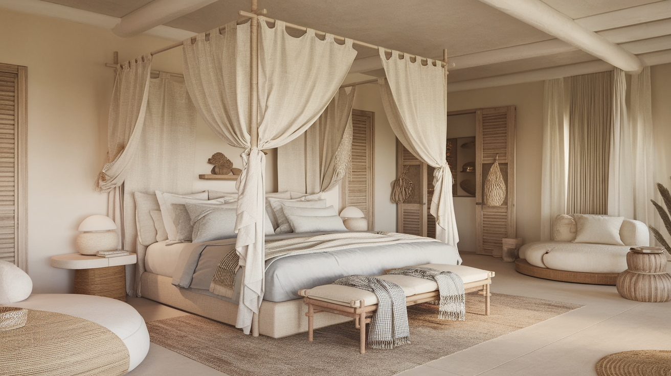 For larger spaces, opt for an open concept that flows seamlessly into the rest of the home. Create zones with natural materials and a soft color palette to keep the bedroom airy and connected to the surrounding living space.