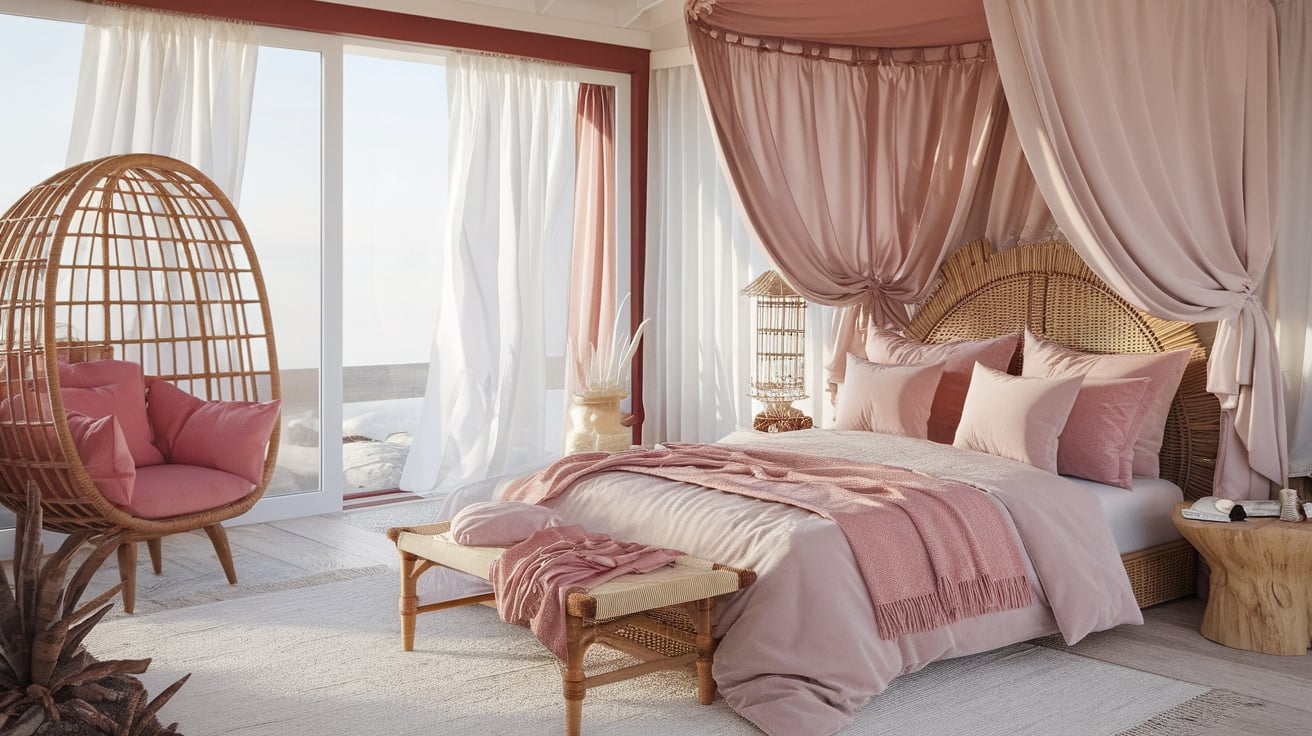 For a romantic coastal bedroom, blend soft hues like pale blue, blush pink, and white to create a calming atmosphere.