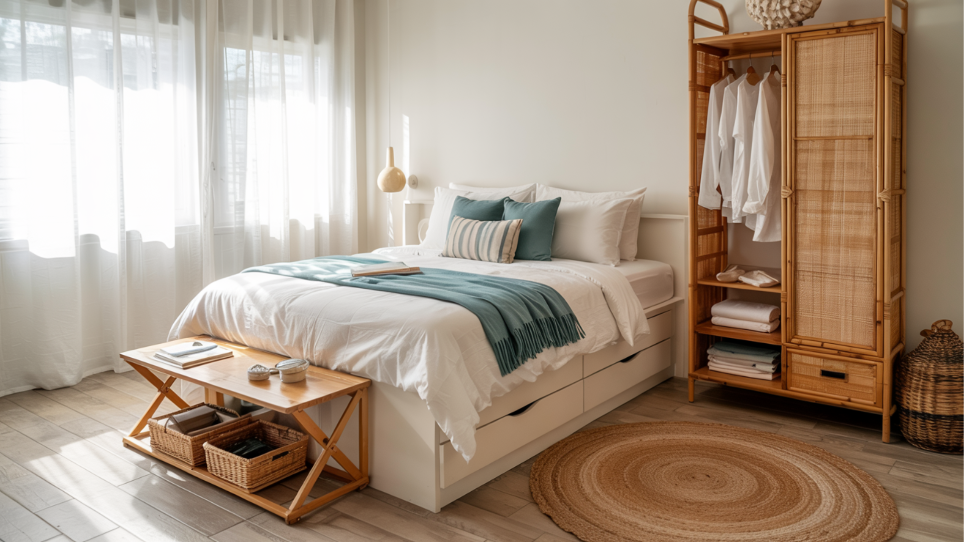 10. Small Coastal Bedroom with Multi-Functional Furniture
