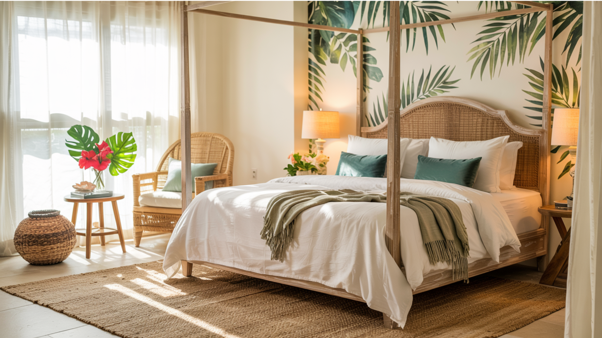 Bring a tropical twist to your coastal bedroom with lush greenery, palm-leaf accents, and bright colors.