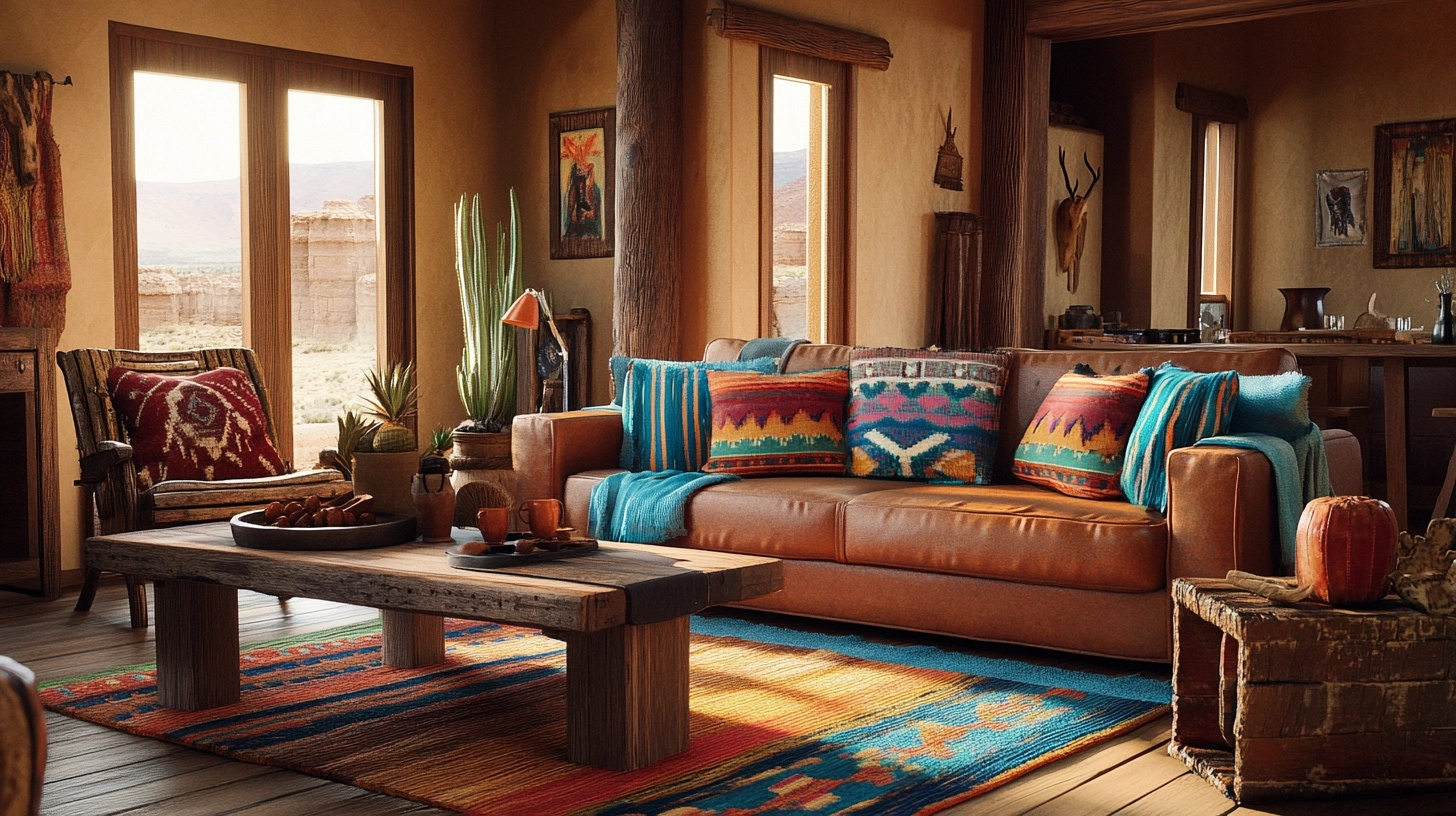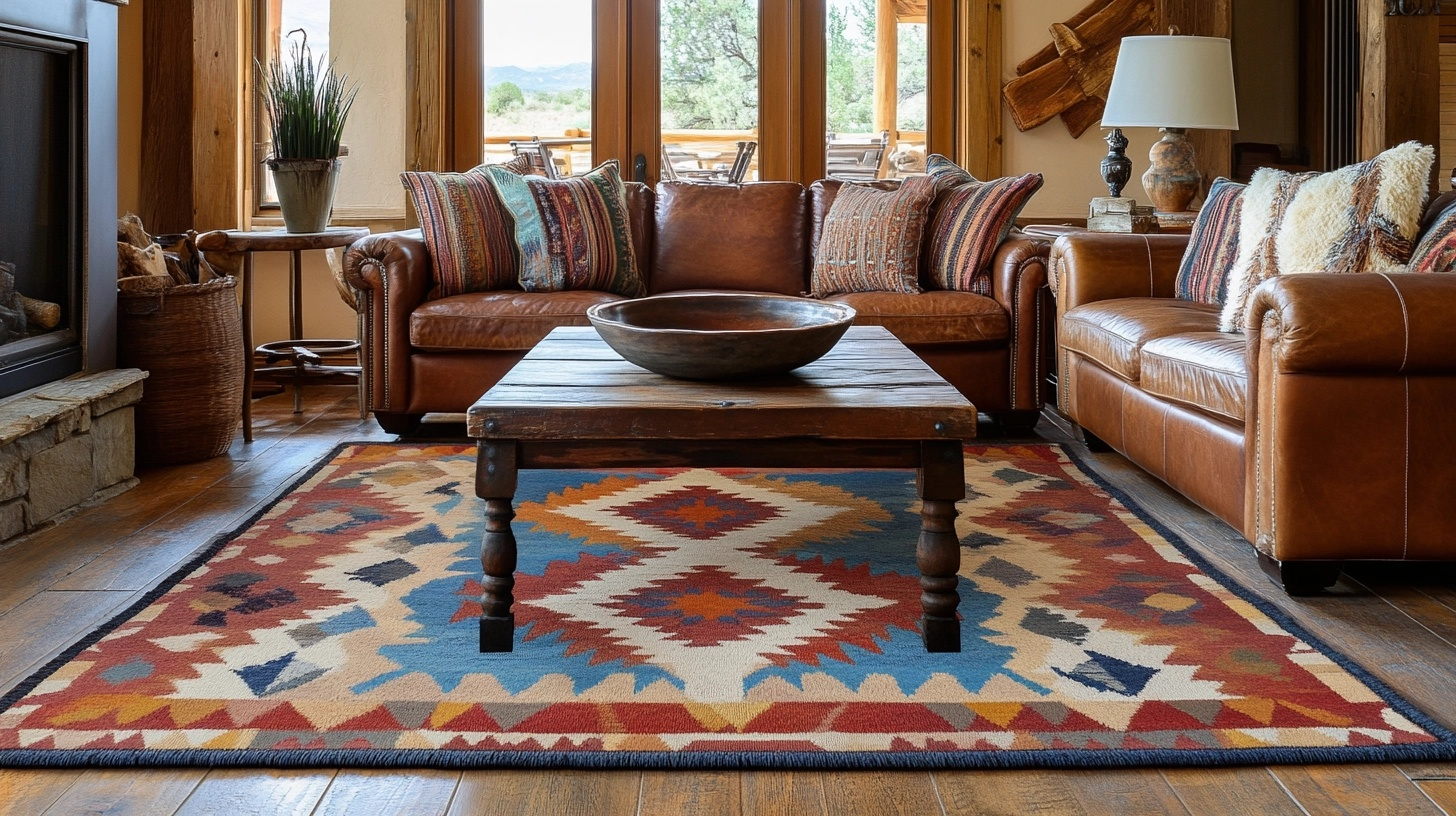 Look for geometric patterns in earth tones with pops of turquoise, rust, or deep red. The angular designs contrast nicely with the organic shapes of leather furniture and natural wood. Choose wool or cotton blends for authenticity and durability.