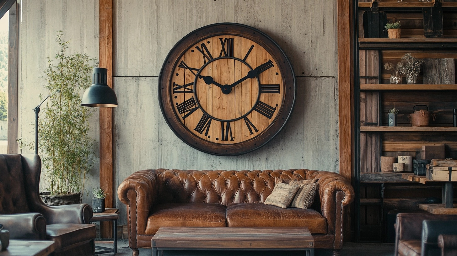 A big wooden wall clock creates a focal point that’s both useful and beautiful in your western living room. These statement pieces bring charm and warmth to any wall.