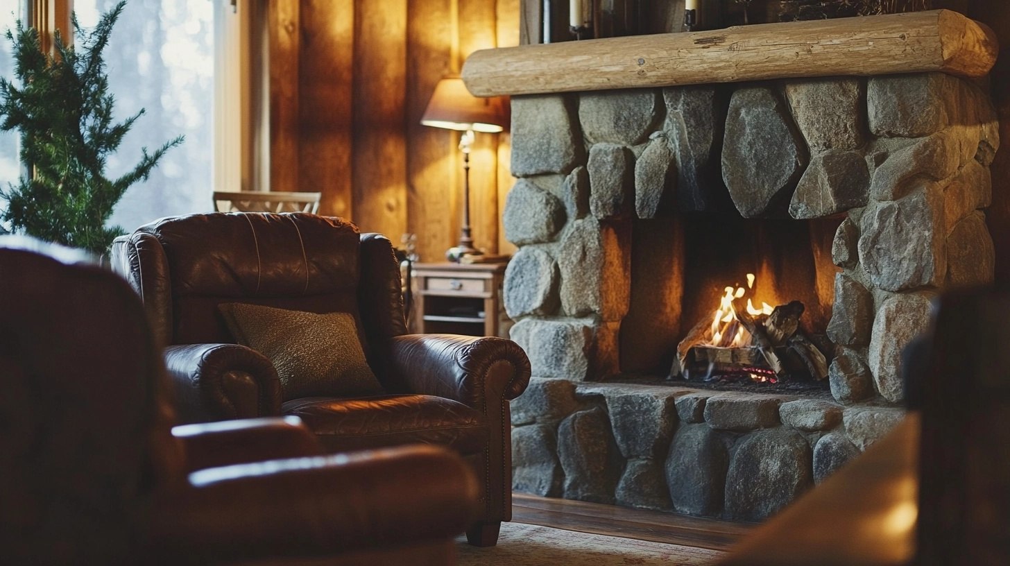 Gas or wood-burning options both work well, though wood adds an extra layer of frontier authenticity. Even in warmer climates where fires are rarely needed, a stone fireplace provides a gathering spot that grounds the room in natural elements.
