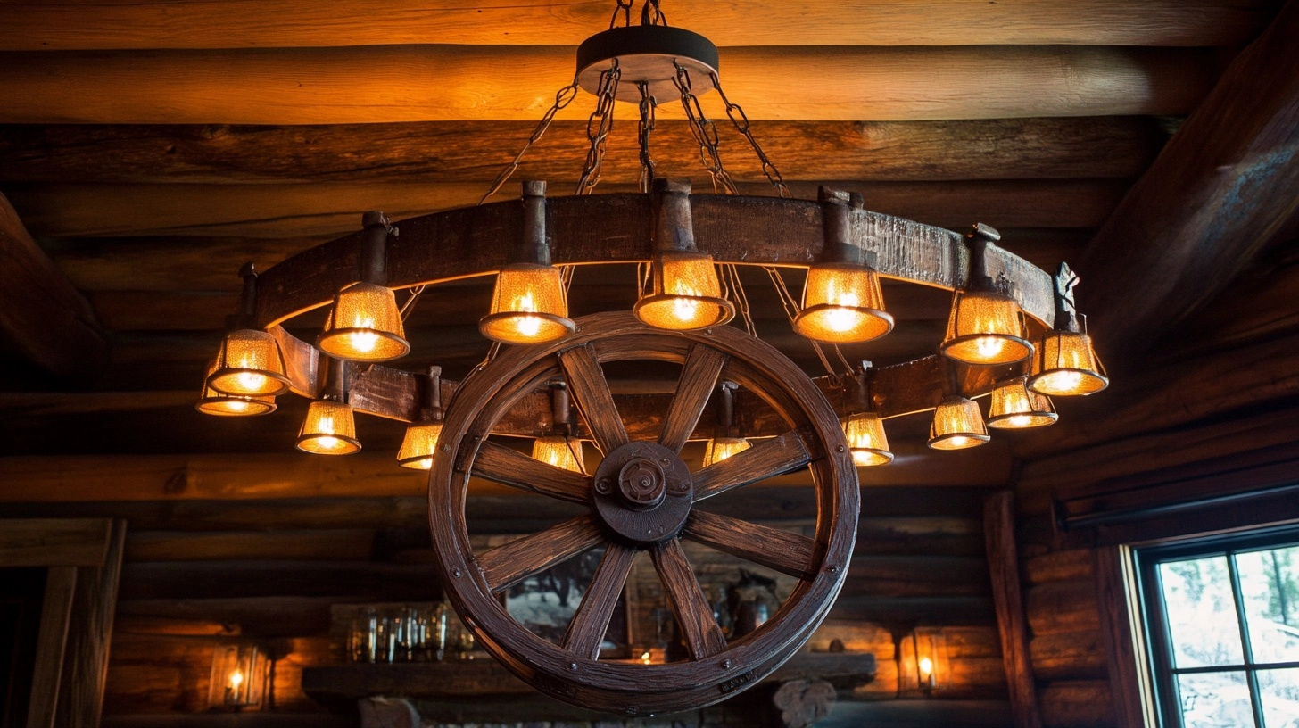 The circular wooden form with metal rim creates a strong visual that draws the eye upward. Look for fixtures with small bulbs arranged around the wheel’s circumference for even light distribution. Some designs incorporate metal lanterns hanging from the wheel for added western charm.