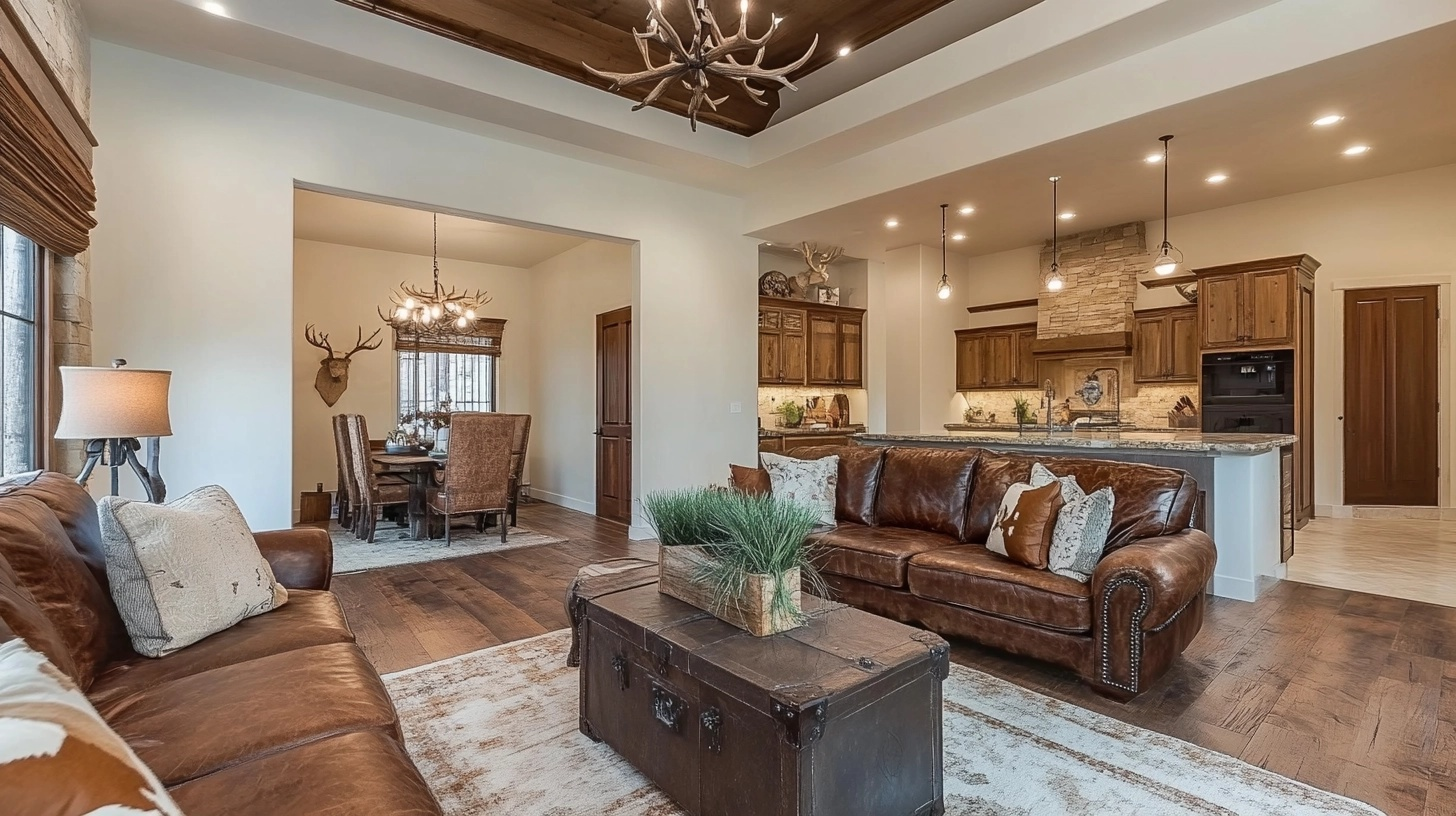 A Western living room brings together rustic elements inspired by old frontier styles. This design approach focuses on warmth, comfort, and a connection to nature and rural living. The style draws from ranch life and the natural beauty of the American West.