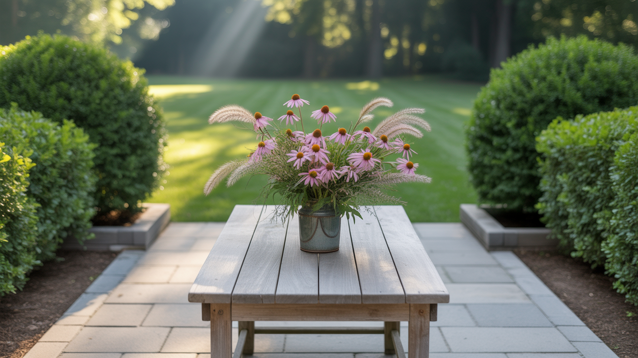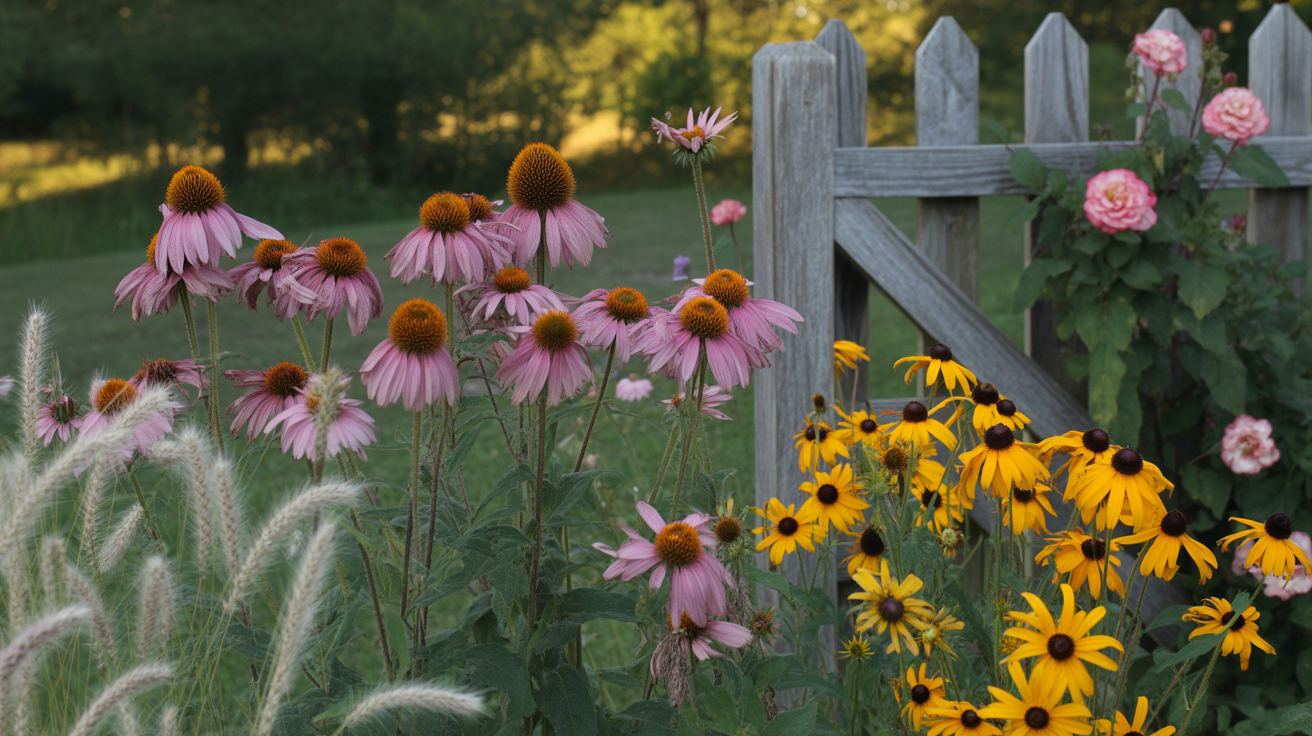 Plants such as coneflowers, echinacea, and feather reed grass offer color, texture, and seasonal variety.